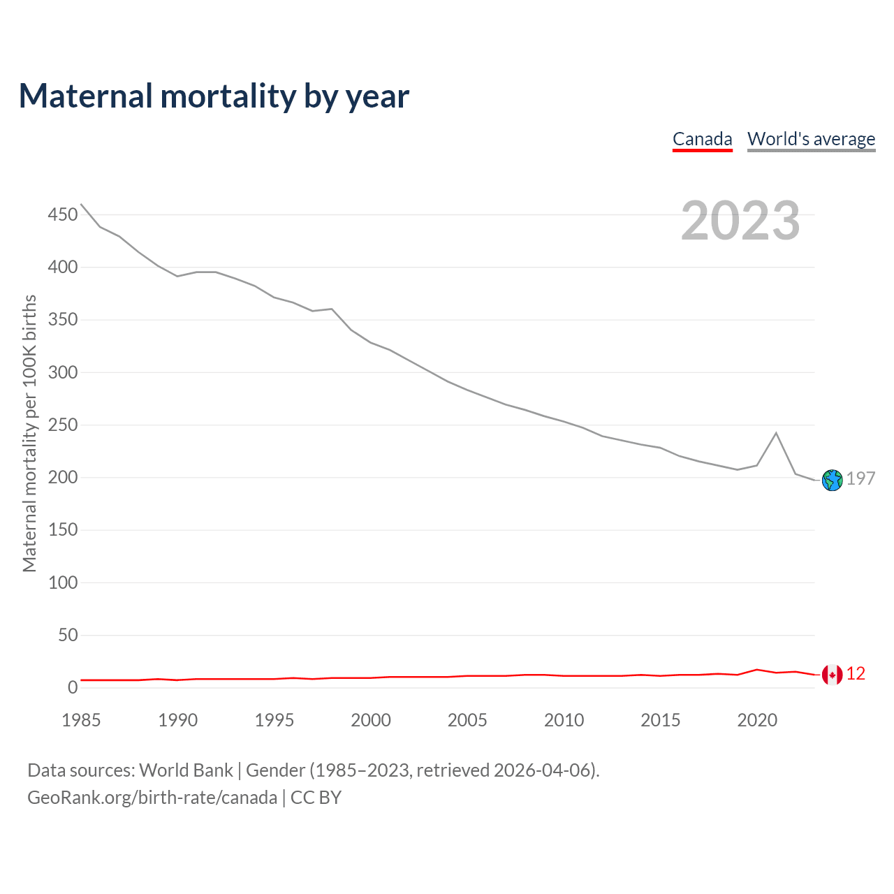 The maternal mortality rate in Canada was 12 deaths per 100,000 live births in 2023 — a 0.01% chance of dying during childbirth or within 42 days of pregnancy termination. This is a 33.3% increase compared to the year 2000.