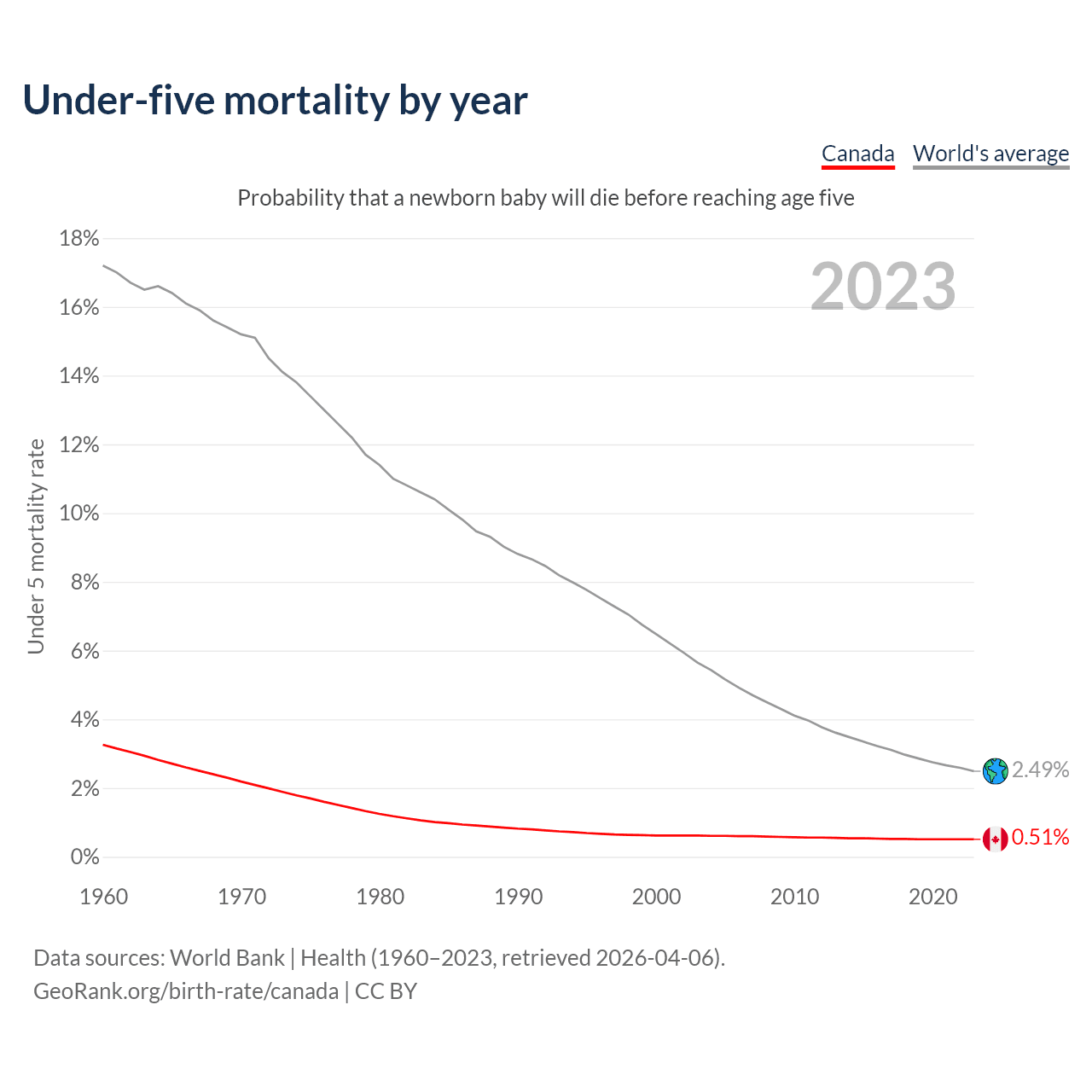 The under-5 mortality rate in Canada was 5.1 deaths per 1,000 live births in 2023 — a 0.51% chance that a newborn baby will die before reaching age five. This is down from 6.2 deaths per 1,000 live births in 2000.