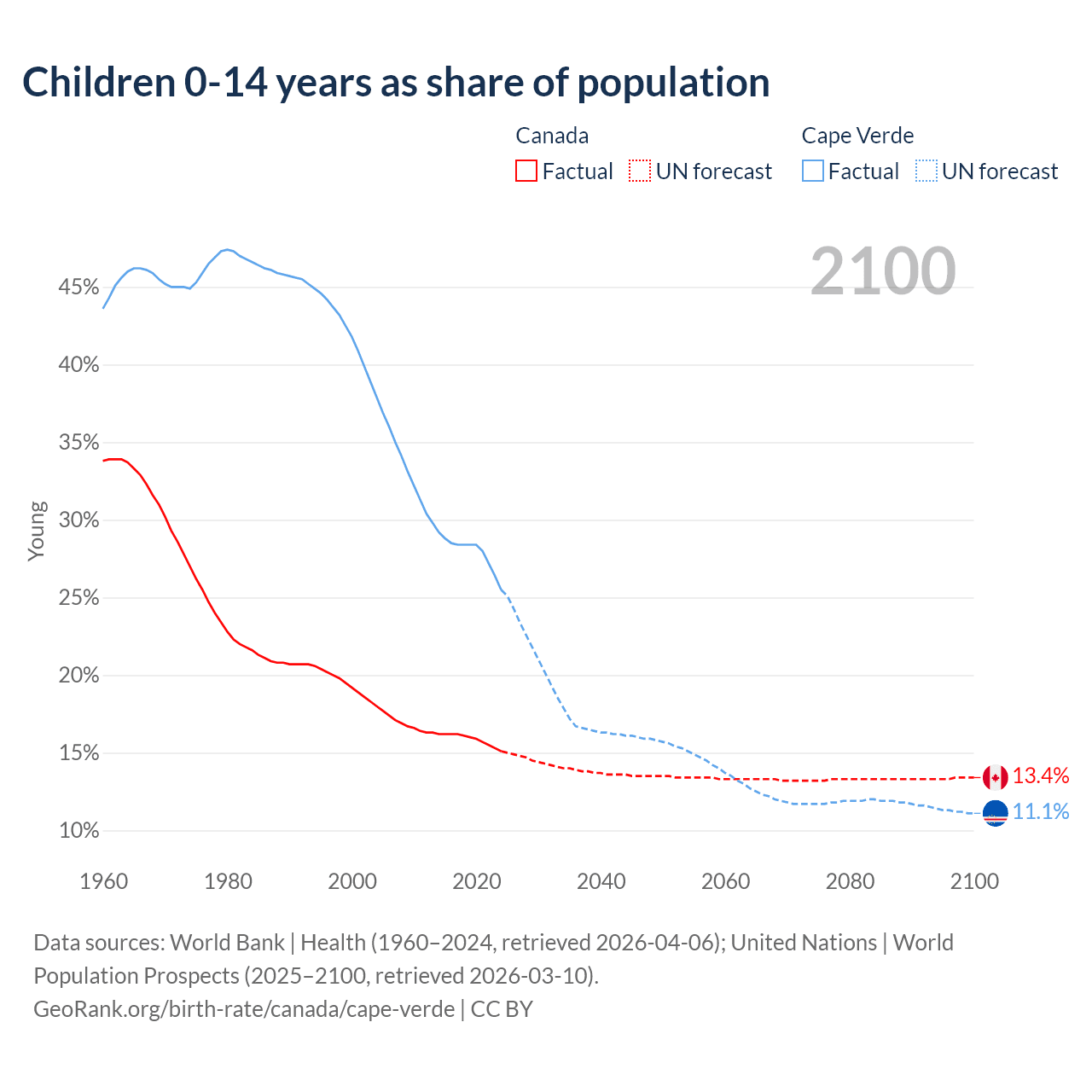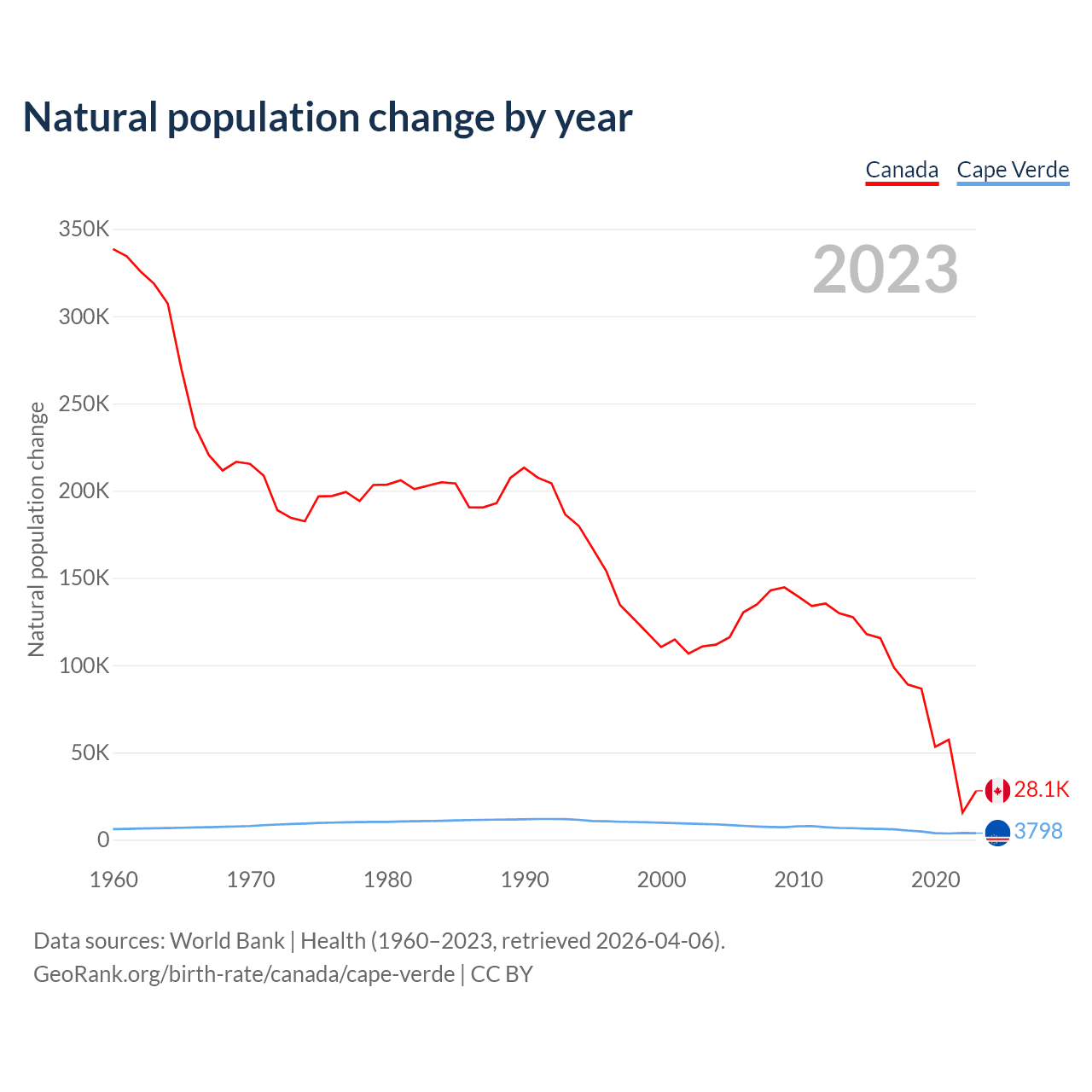 According to the latest available data on birth rates, the fertility rate in Canada was 1.26 children per woman in 2023, compared to 1.52 in Cape Verde in 2023. The replacement level is considered to be 2.1 children per woman.