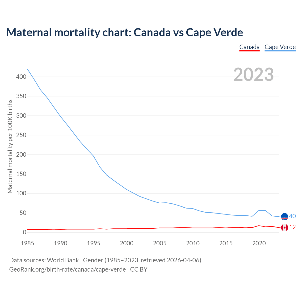 The maternal mortality rate, which is the probability of dying during childbirth or within 42 days of pregnancy termination, is 12 deaths per 100,000 live births in Canada, compared to 40 deaths in Cape Verde.