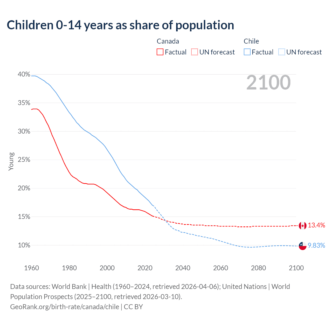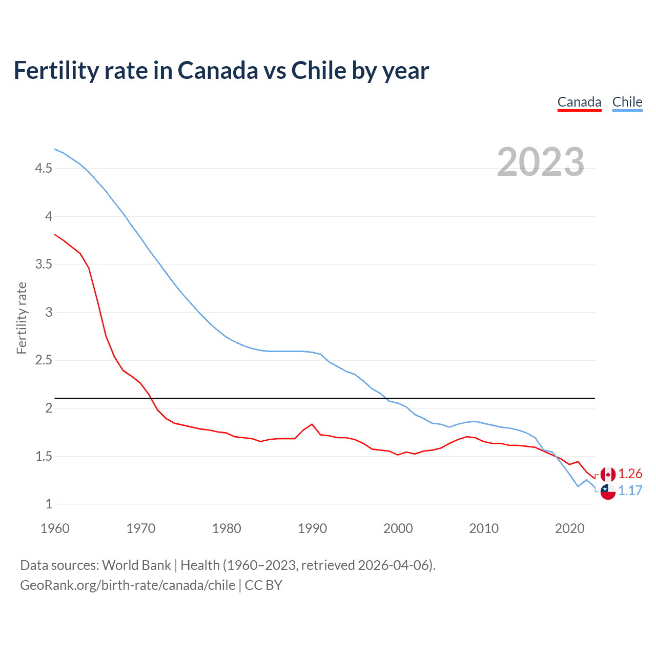 According to the latest available data on birth rates, the fertility rate in Canada was 1.26 children per woman in 2023, compared to 1.17 in Chile in 2023. The replacement level is considered to be 2.1 children per woman.