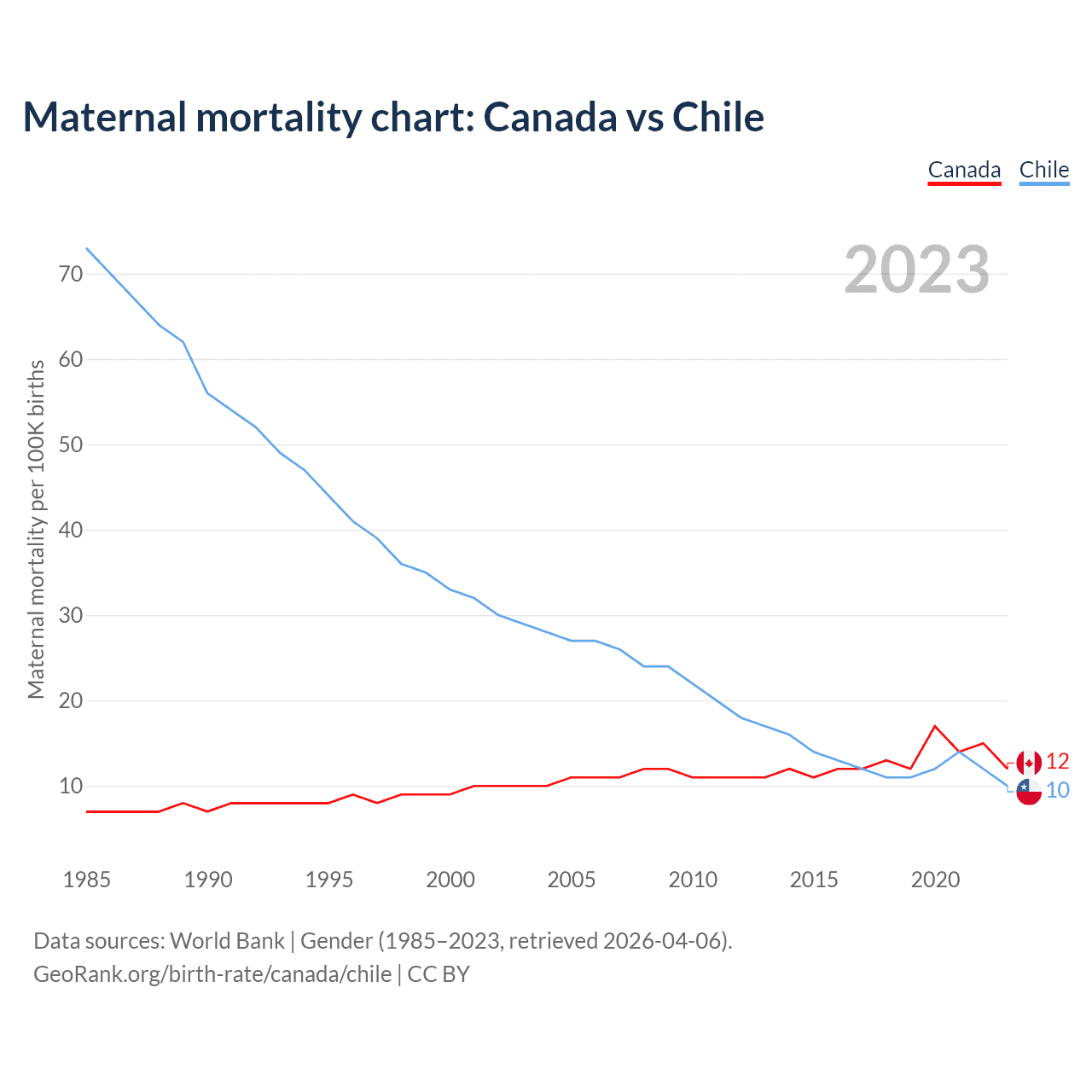 The maternal mortality rate, which is the probability of dying during childbirth or within 42 days of pregnancy termination, is 12 deaths per 100,000 live births in Canada, compared to 10 deaths in Chile.