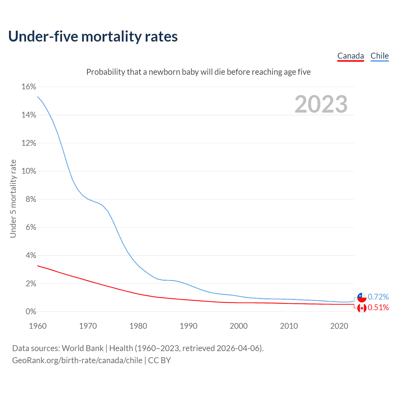 The chance that a newborn baby will die before reaching age five is 0.51% in Canada and 0.72% in Chile. Above is a chart with historical data on under-five mortality rates.