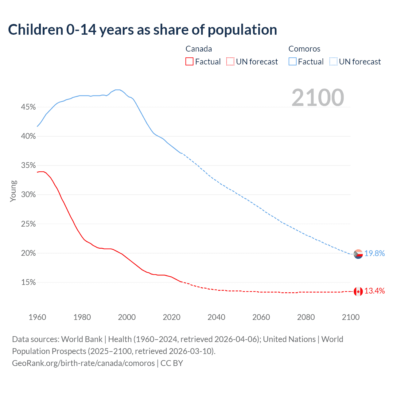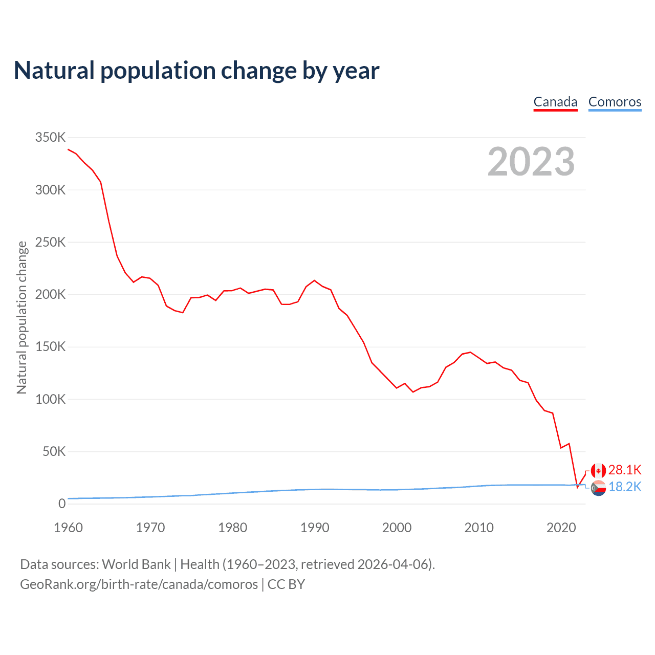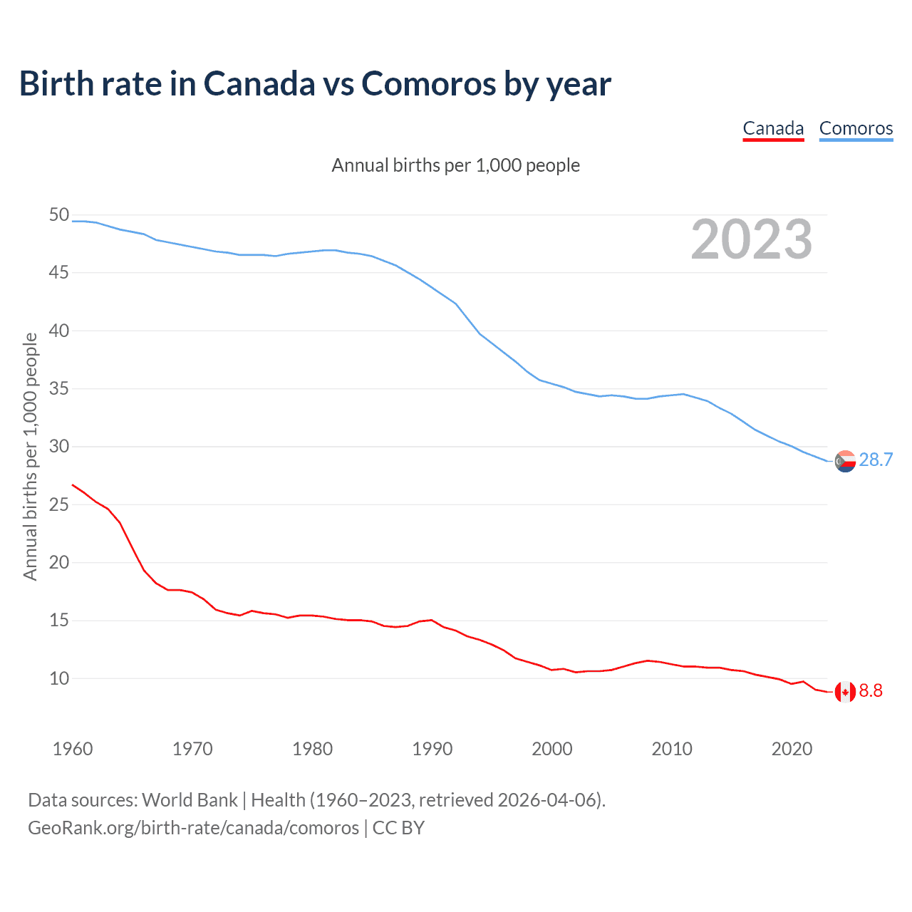 Canada has an annual birth rate of 8.8 births per 1,000 people, compared to 28.7 for Comoros. The average number of children a woman is expected to have during her lifetime — the fertility rate, is 1.26 in Canada and 3.88 in Comoros — 207.8% difference.