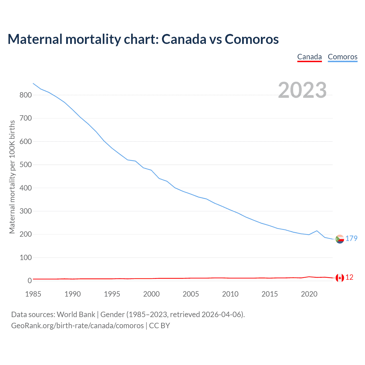 The maternal mortality rate, which is the probability of dying during childbirth or within 42 days of pregnancy termination, is 12 deaths per 100,000 live births in Canada, compared to 179 deaths in Comoros.