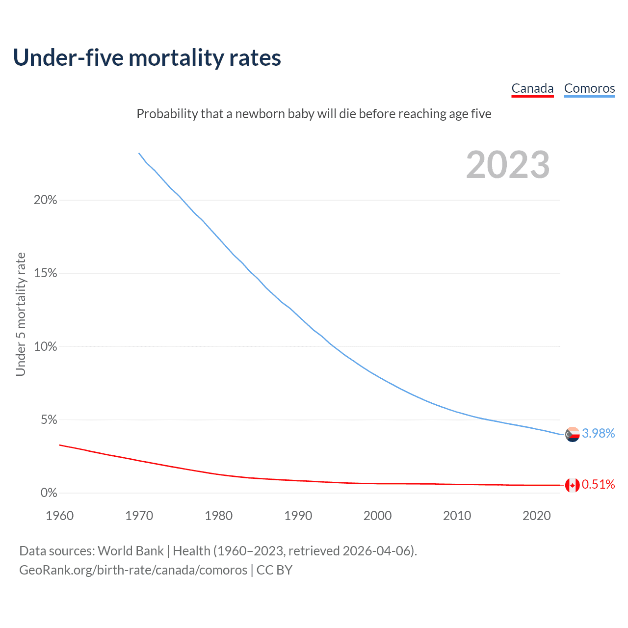 The chance that a newborn baby will die before reaching age five is 0.51% in Canada and 3.98% in Comoros. Above is a chart with historical data on under-five mortality rates.