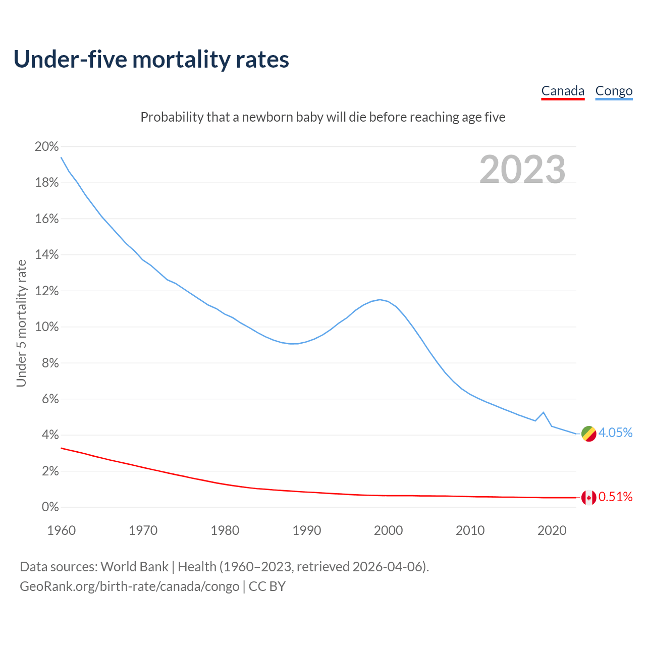The chance that a newborn baby will die before reaching age five is 0.51% in Canada and 4.05% in the Congo. Above is a chart with historical data on under-five mortality rates.
