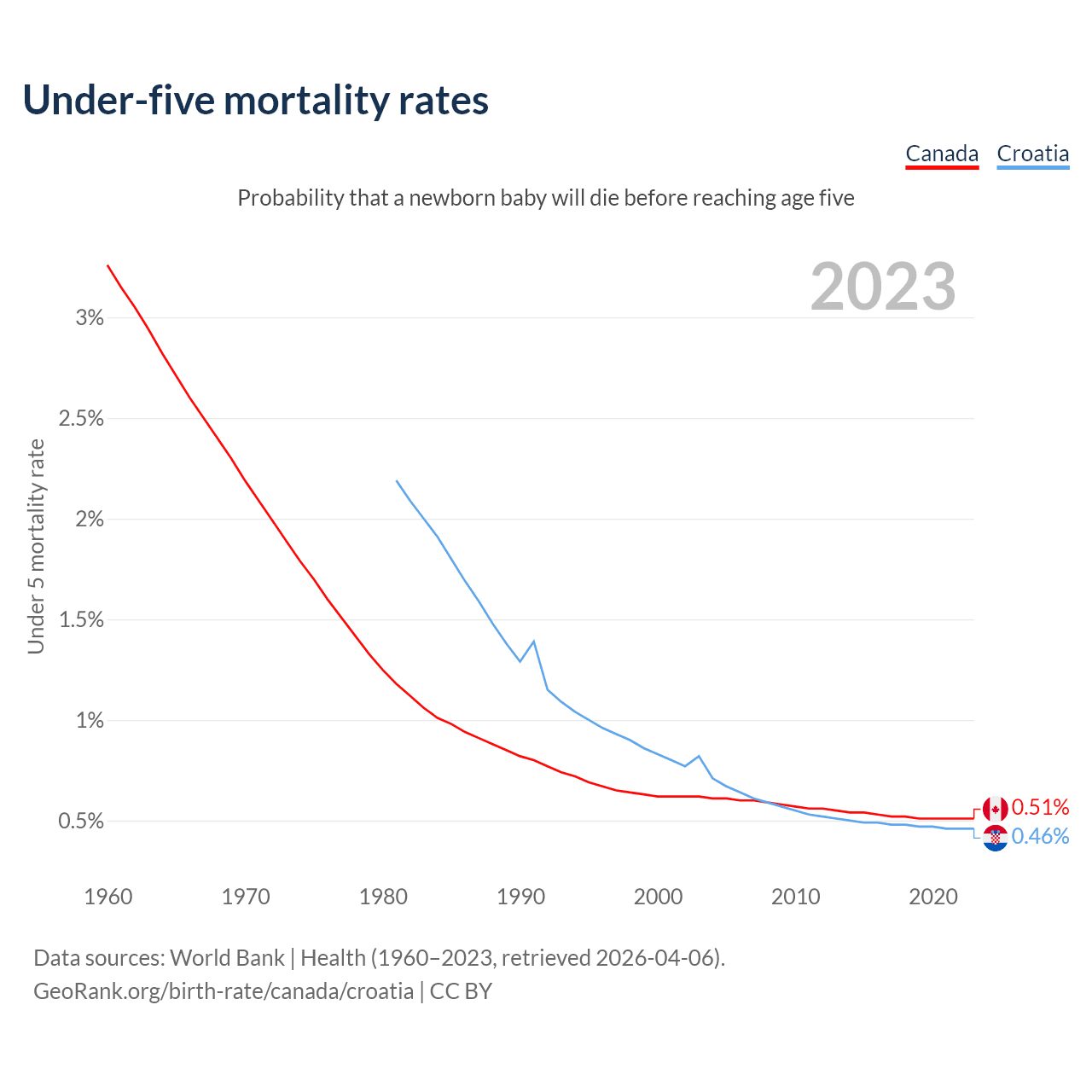 The chance that a newborn baby will die before reaching age five is 0.51% in Canada and 0.46% in Croatia. Above is a chart with historical data on under-five mortality rates.