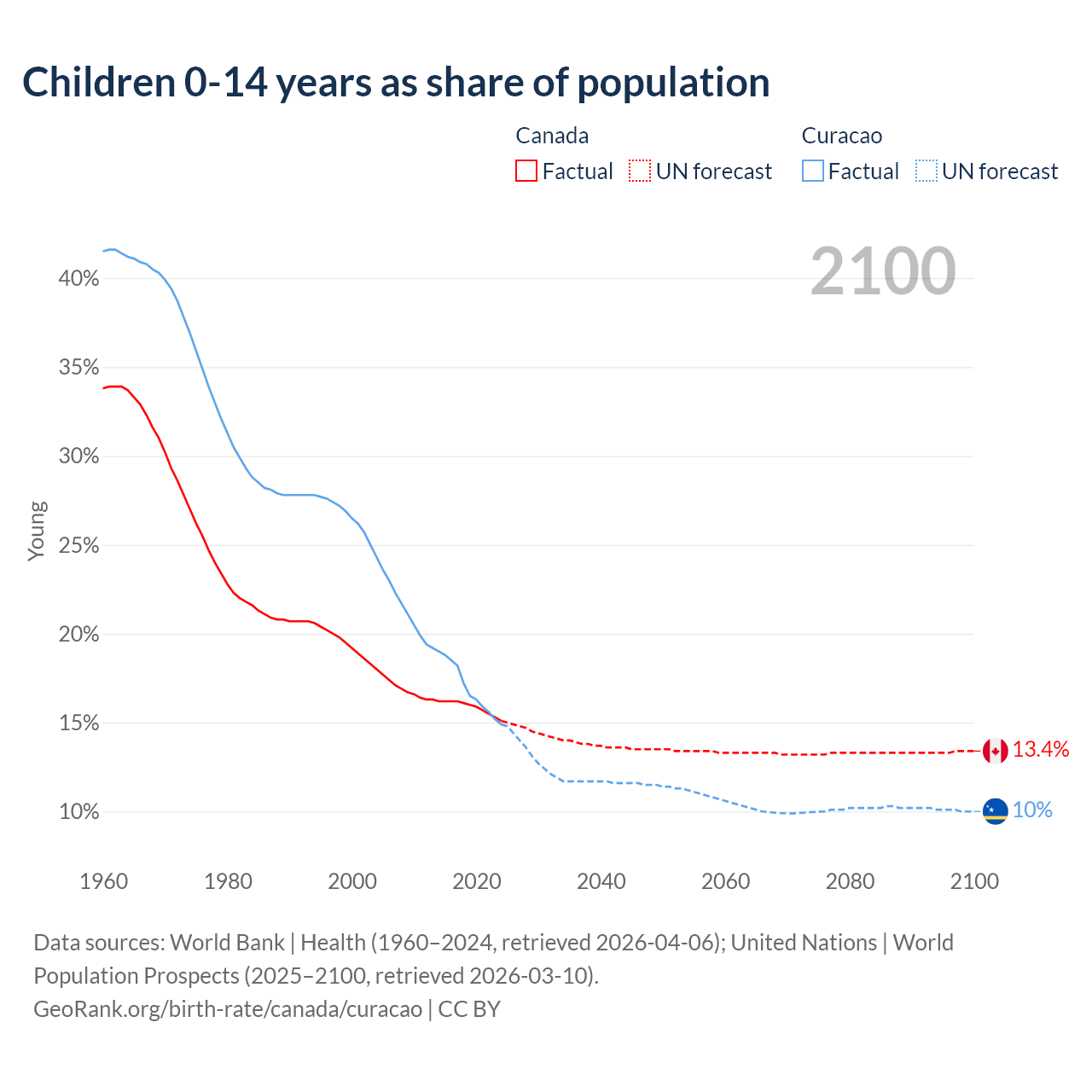 Children aged 0-14 make up 15.1% of the population in Canada and 14.9% in Curacao in 2024, compared to 20.7% and 27.8% respectively in 1990.