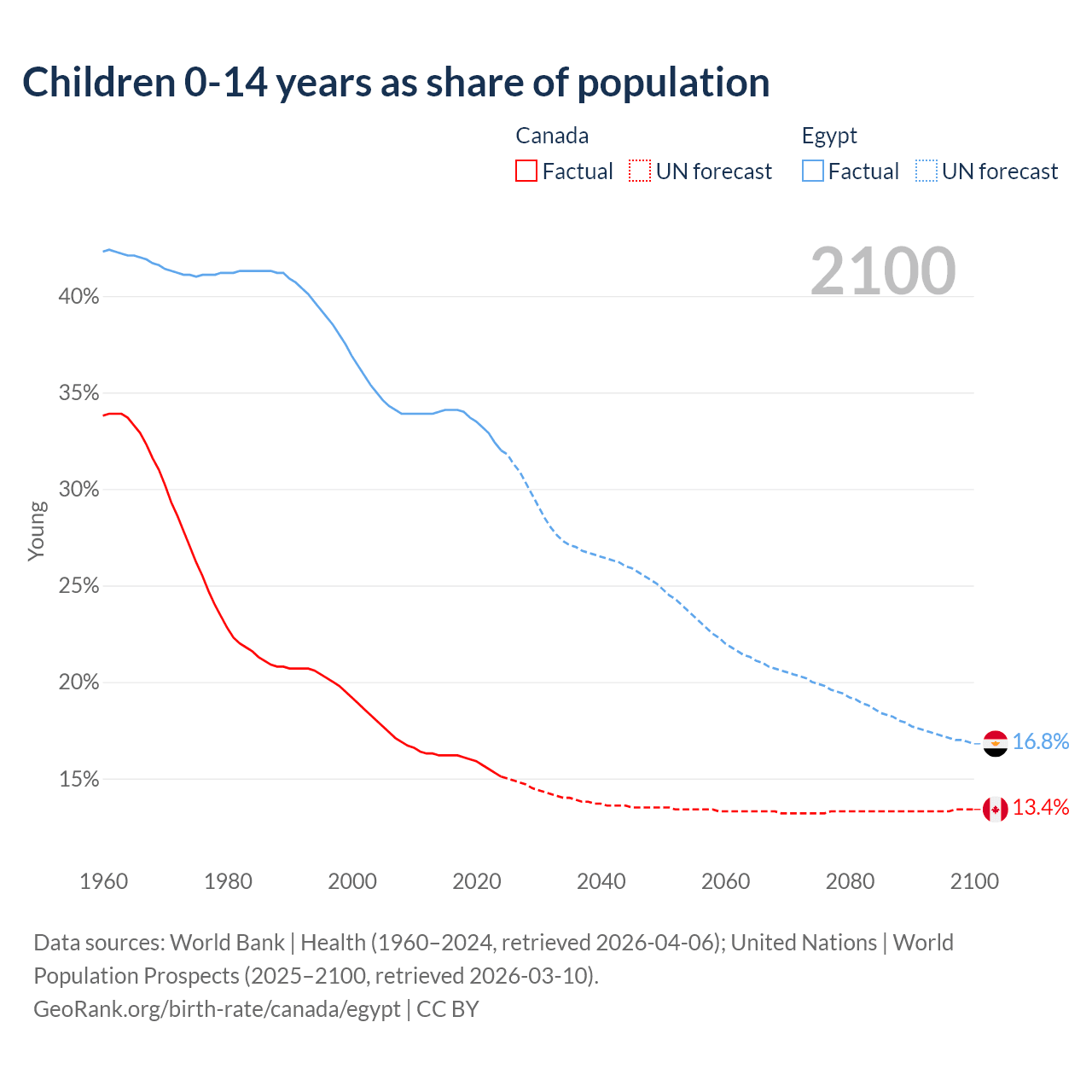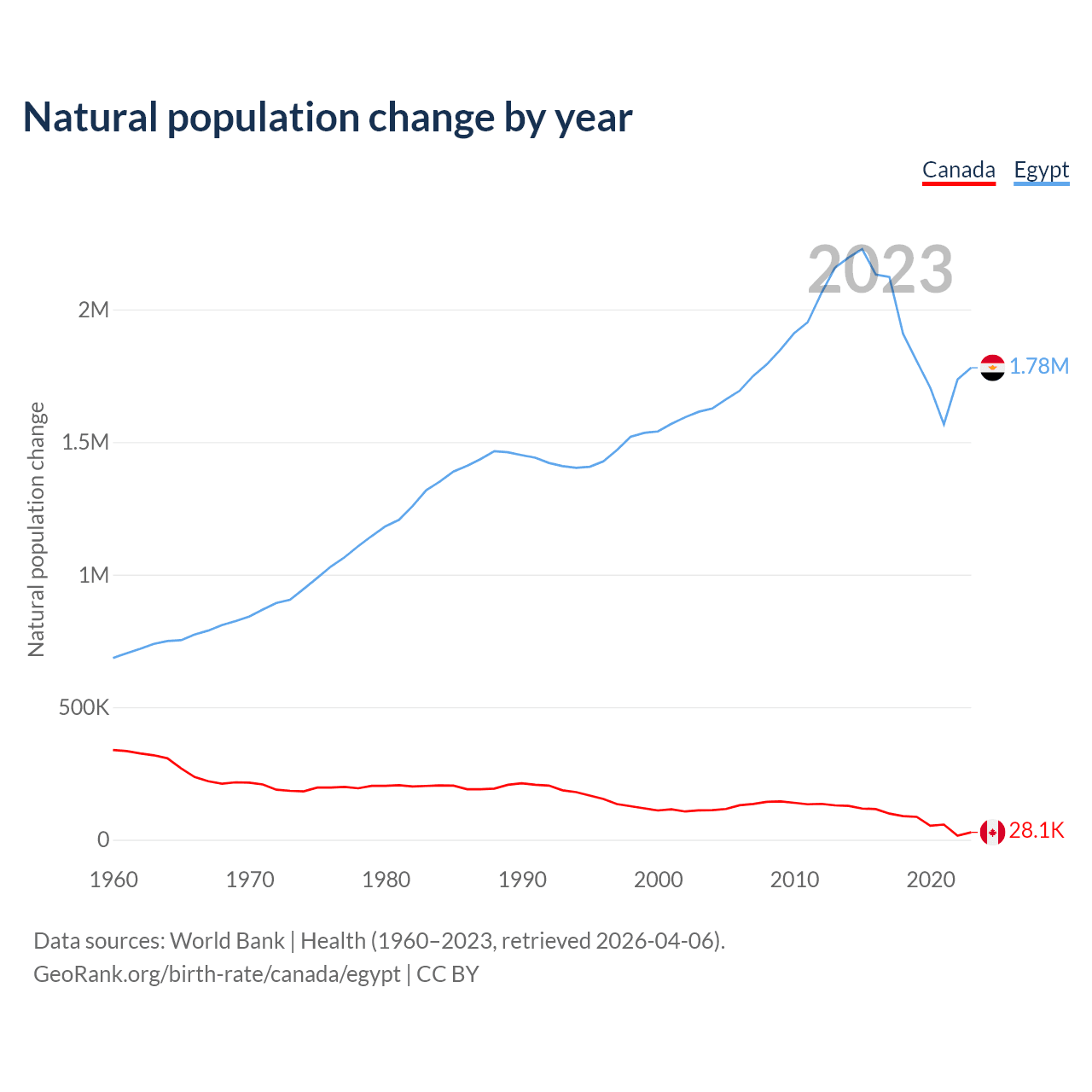 According to the latest available data on birth rates, the fertility rate in Canada was 1.26 children per woman in 2023, compared to 2.75 in Egypt in 2023. The replacement level is considered to be 2.1 children per woman.