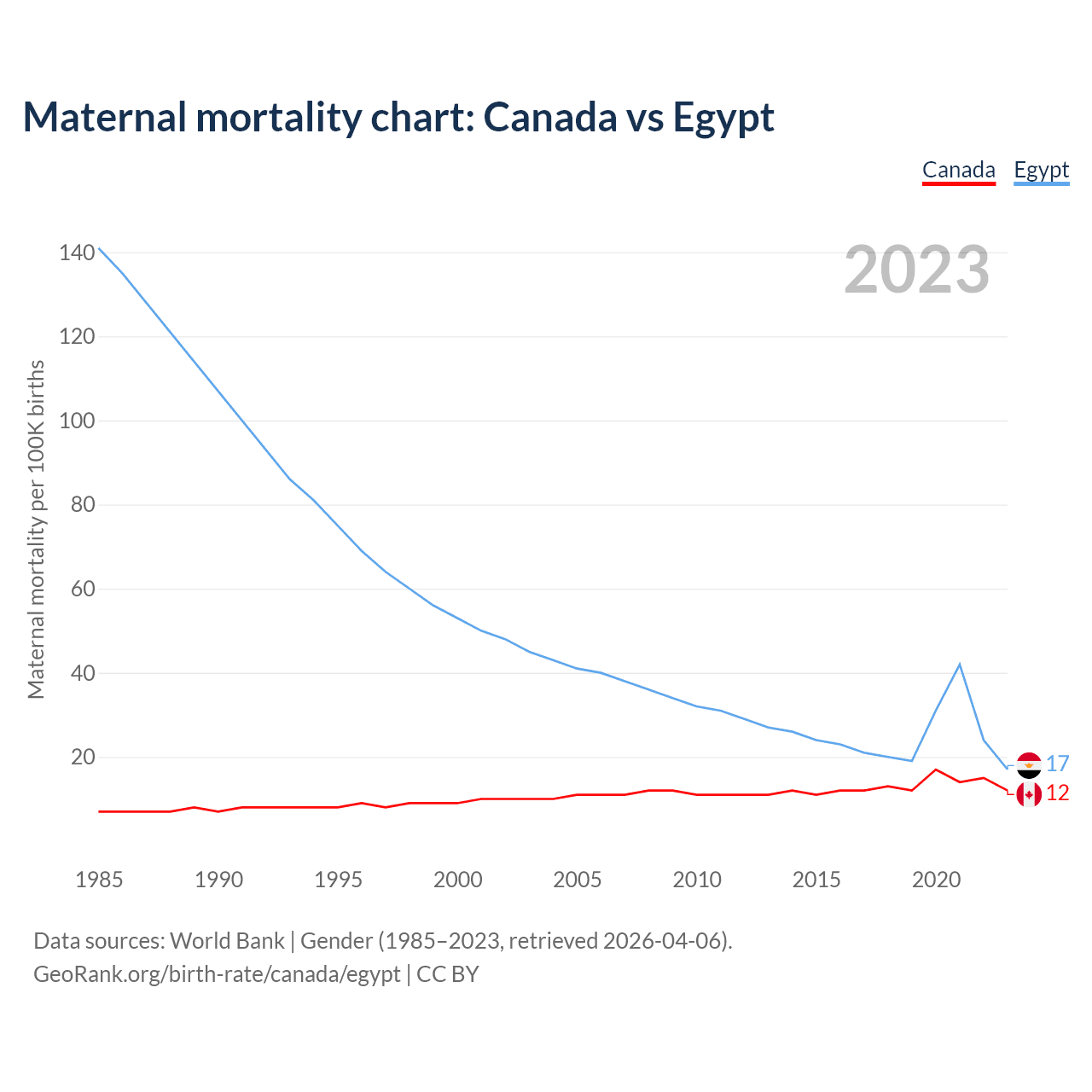 The maternal mortality rate, which is the probability of dying during childbirth or within 42 days of pregnancy termination, is 12 deaths per 100,000 live births in Canada, compared to 17 deaths in Egypt.