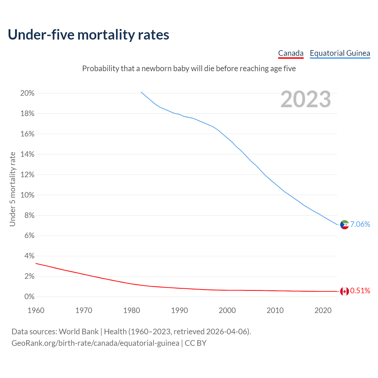 The chance that a newborn baby will die before reaching age five is 0.51% in Canada and 7.06% in Equatorial Guinea. Above is a chart with historical data on under-five mortality rates.
