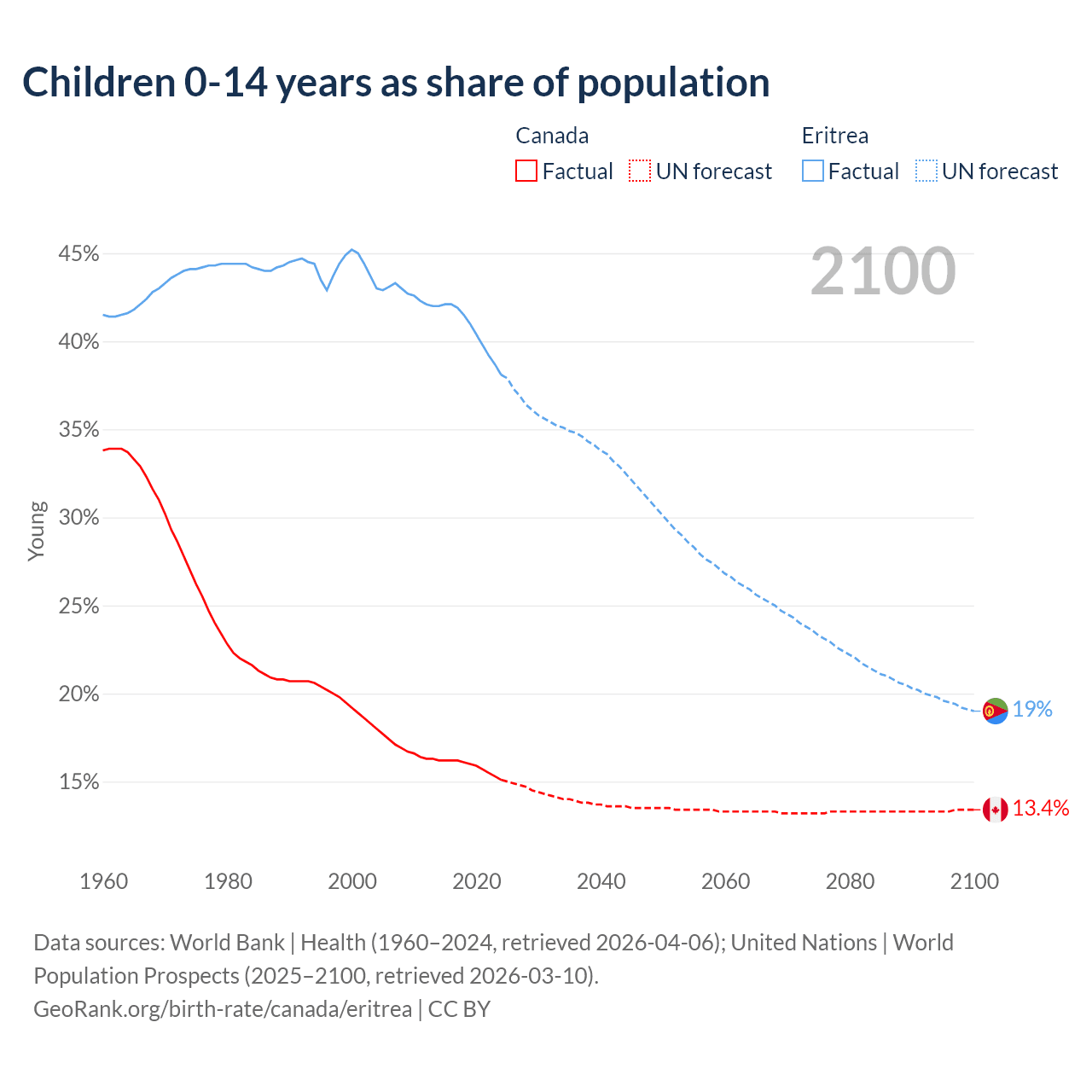 Canada has an annual birth rate of 8.8 births per 1,000 people, compared to 28.5 for Eritrea. The average number of children a woman is expected to have during her lifetime — the fertility rate, is 1.26 in Canada and 3.71 in Eritrea — 194.7% difference.