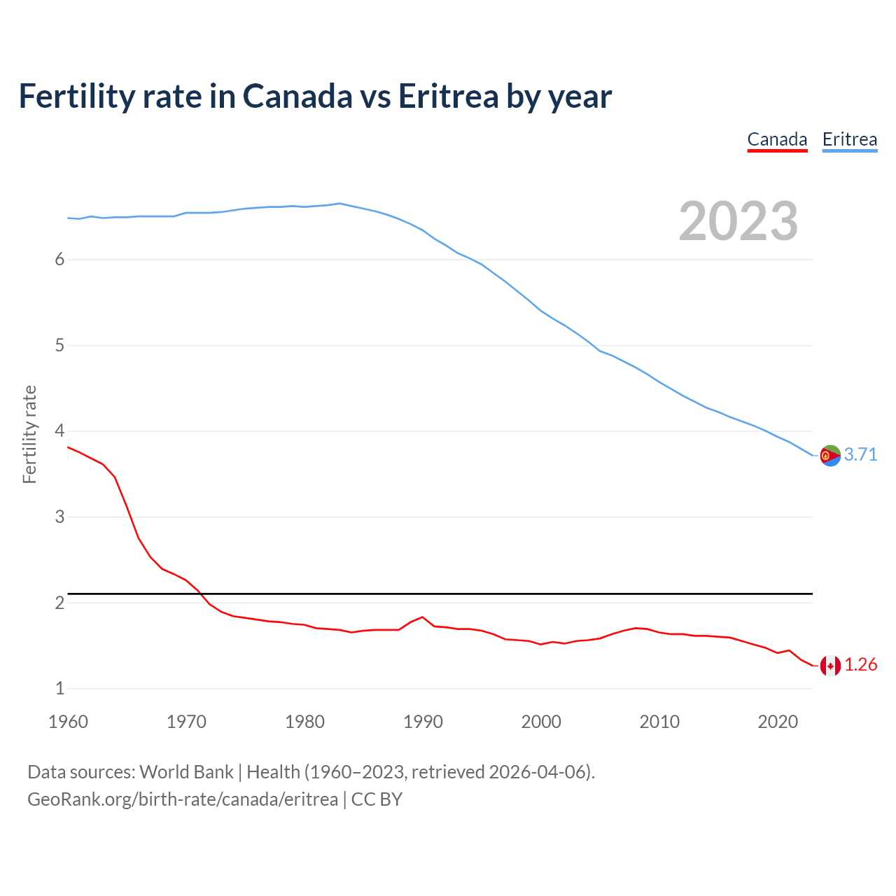 According to the latest available data on birth rates, the fertility rate in Canada was 1.26 children per woman in 2023, compared to 3.71 in Eritrea in 2023. The replacement level is considered to be 2.1 children per woman.