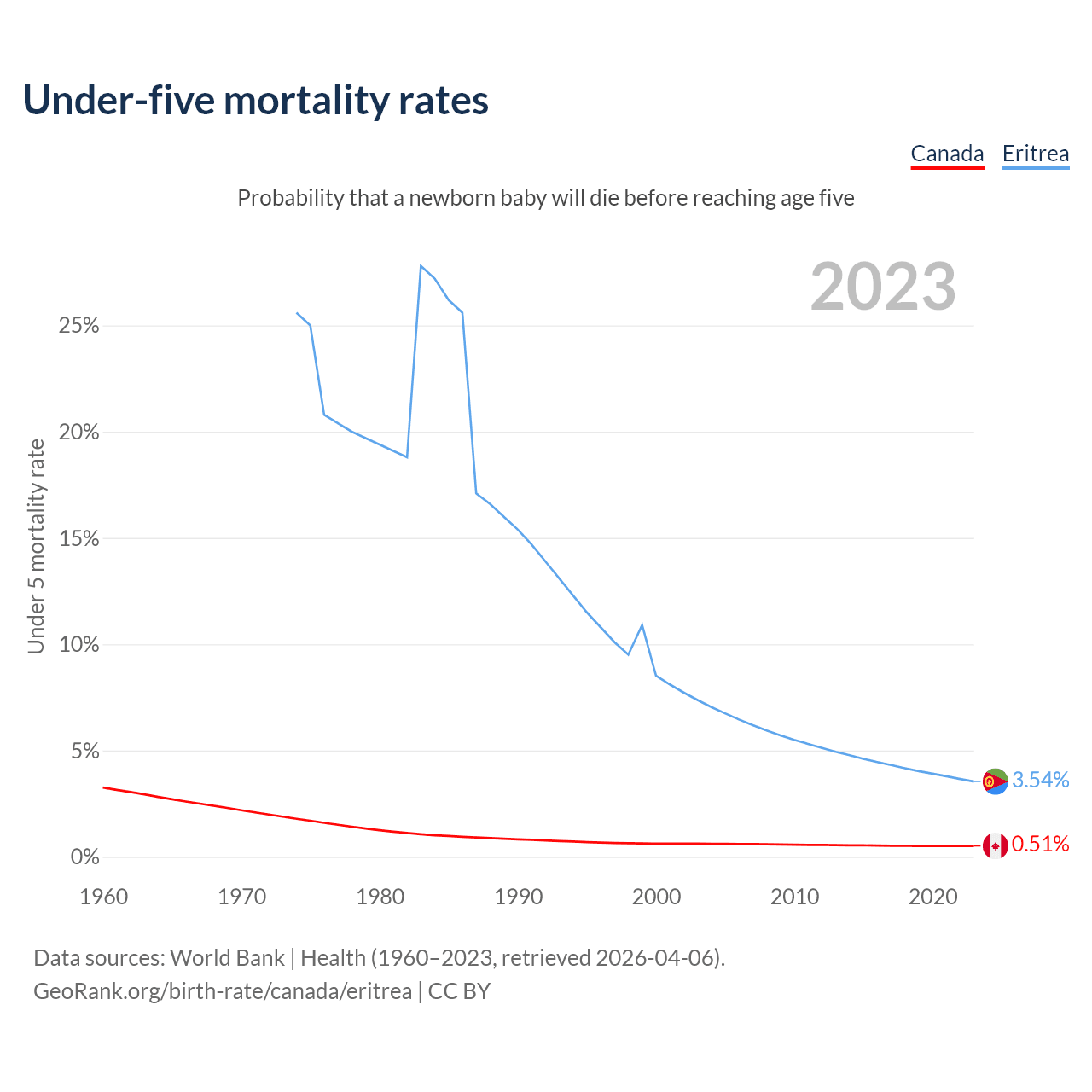 The chance that a newborn baby will die before reaching age five is 0.51% in Canada and 3.54% in Eritrea. Above is a chart with historical data on under-five mortality rates.