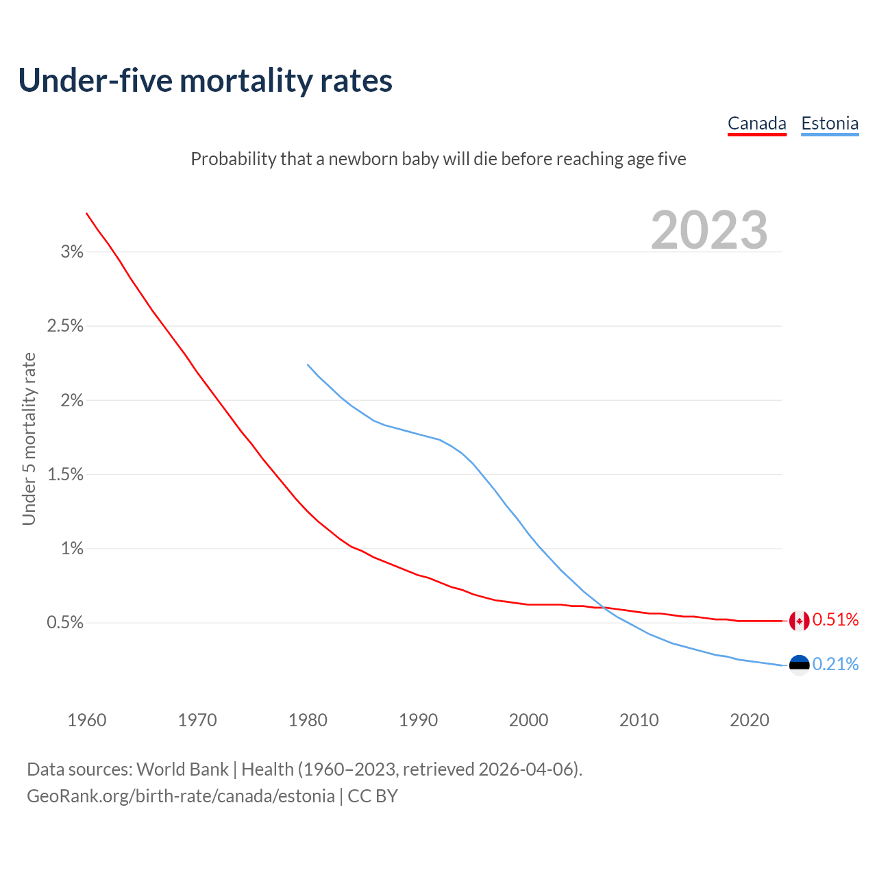 The chance that a newborn baby will die before reaching age five is 0.51% in Canada and 0.21% in Estonia. Above is a chart with historical data on under-five mortality rates.