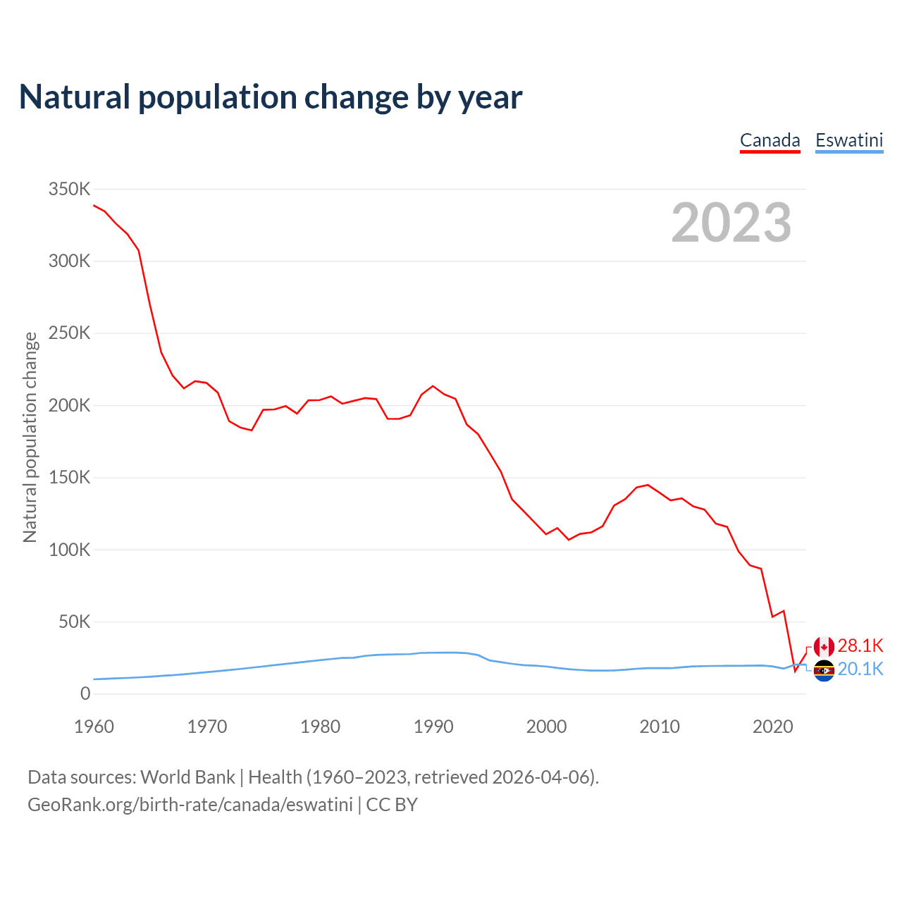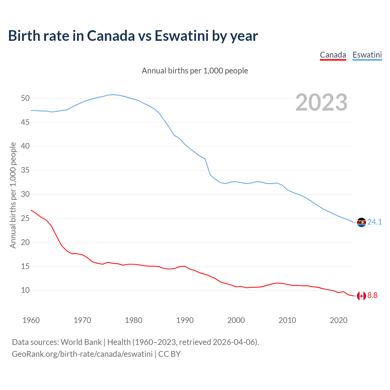 Canada has an annual birth rate of 8.8 births per 1,000 people, compared to 24.1 for Eswatini. The average number of children a woman is expected to have during her lifetime — the fertility rate, is 1.26 in Canada and 2.75 in Eswatini — 118.5% difference.