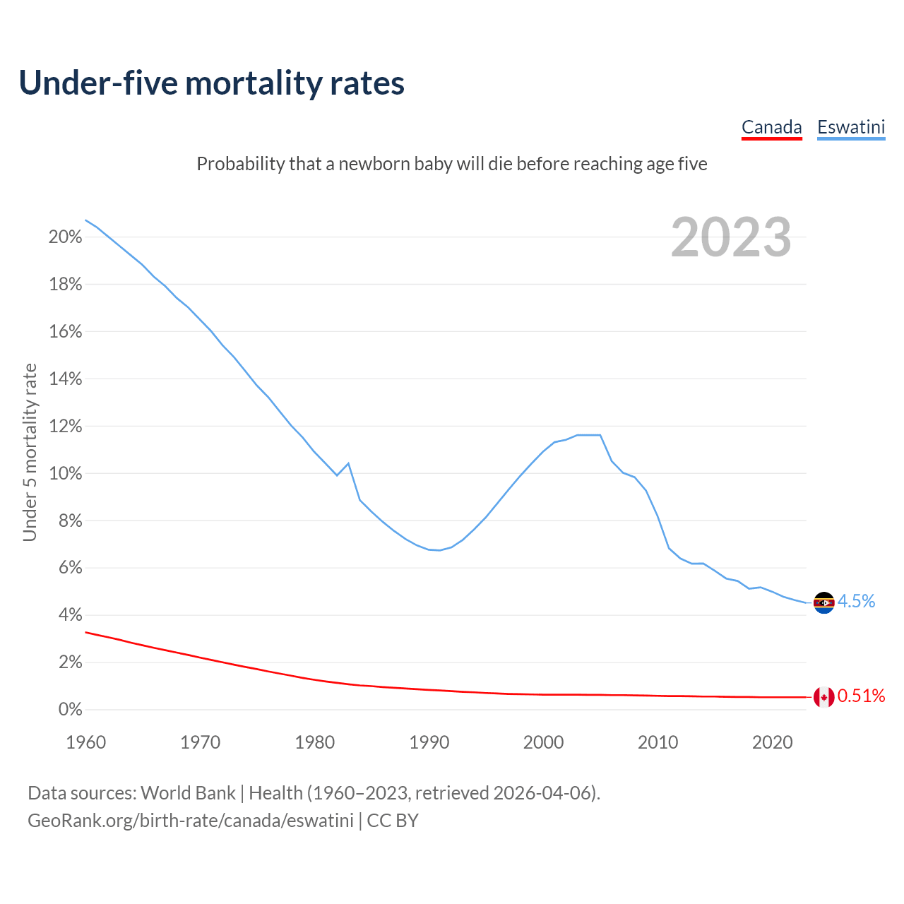 The chance that a newborn baby will die before reaching age five is 0.51% in Canada and 4.5% in Eswatini. Above is a chart with historical data on under-five mortality rates.