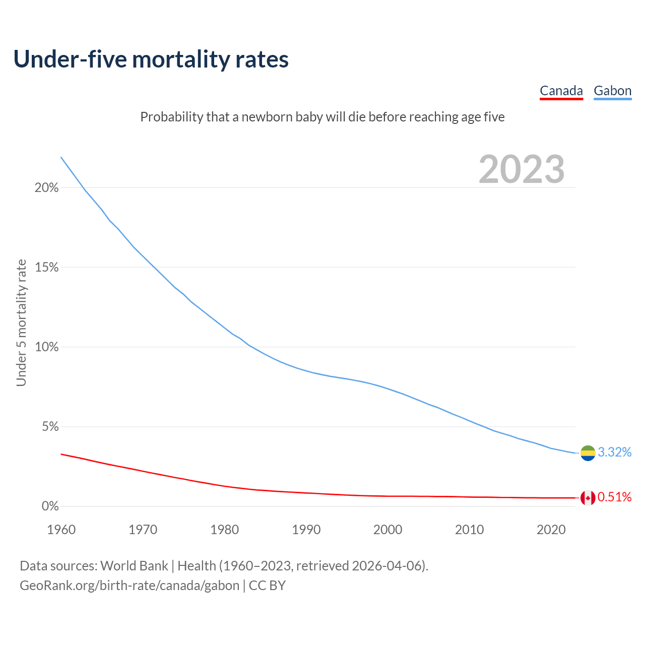 The chance that a newborn baby will die before reaching age five is 0.51% in Canada and 3.32% in Gabon. Above is a chart with historical data on under-five mortality rates.
