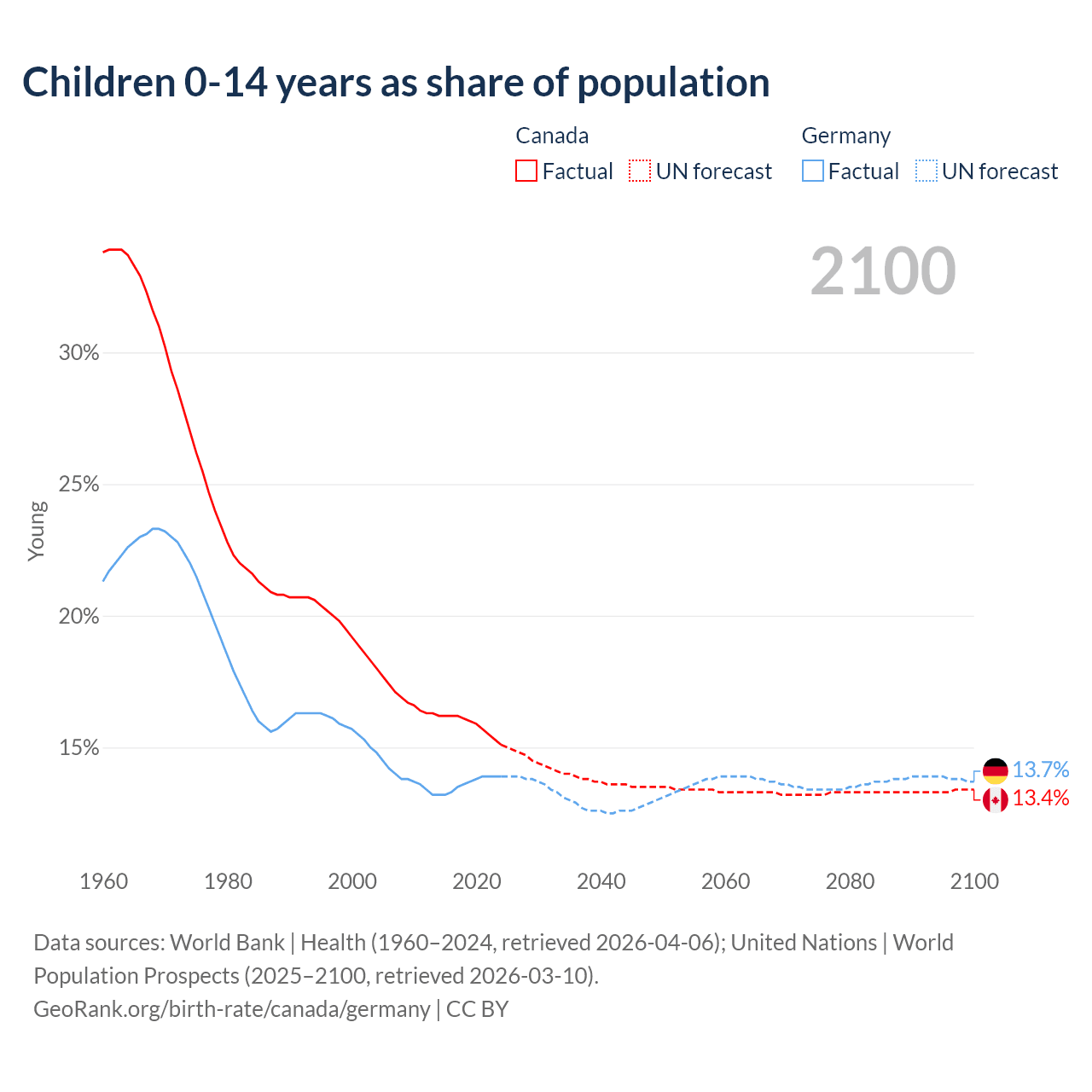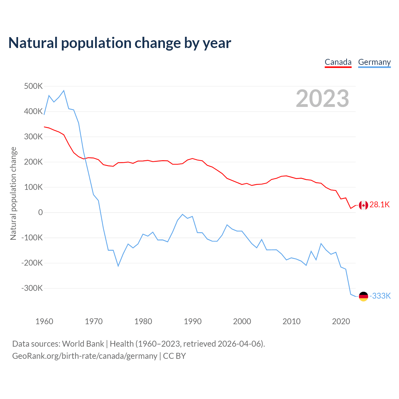 According to the latest available data on birth rates, the fertility rate in Canada was 1.26 children per woman in 2023, compared to 1.39 in Germany in 2023. The replacement level is considered to be 2.1 children per woman.