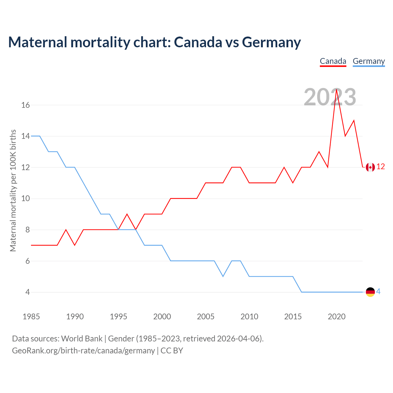 The maternal mortality rate, which is the probability of dying during childbirth or within 42 days of pregnancy termination, is 12 deaths per 100,000 live births in Canada, compared to 4 deaths in Germany.