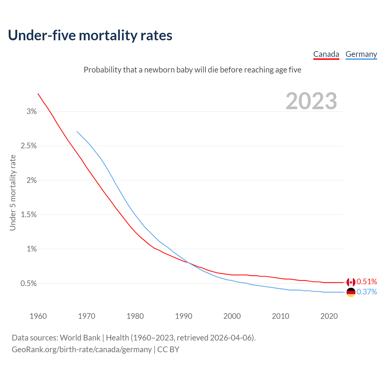 The chance that a newborn baby will die before reaching age five is 0.51% in Canada and 0.37% in Germany. Above is a chart with historical data on under-five mortality rates.