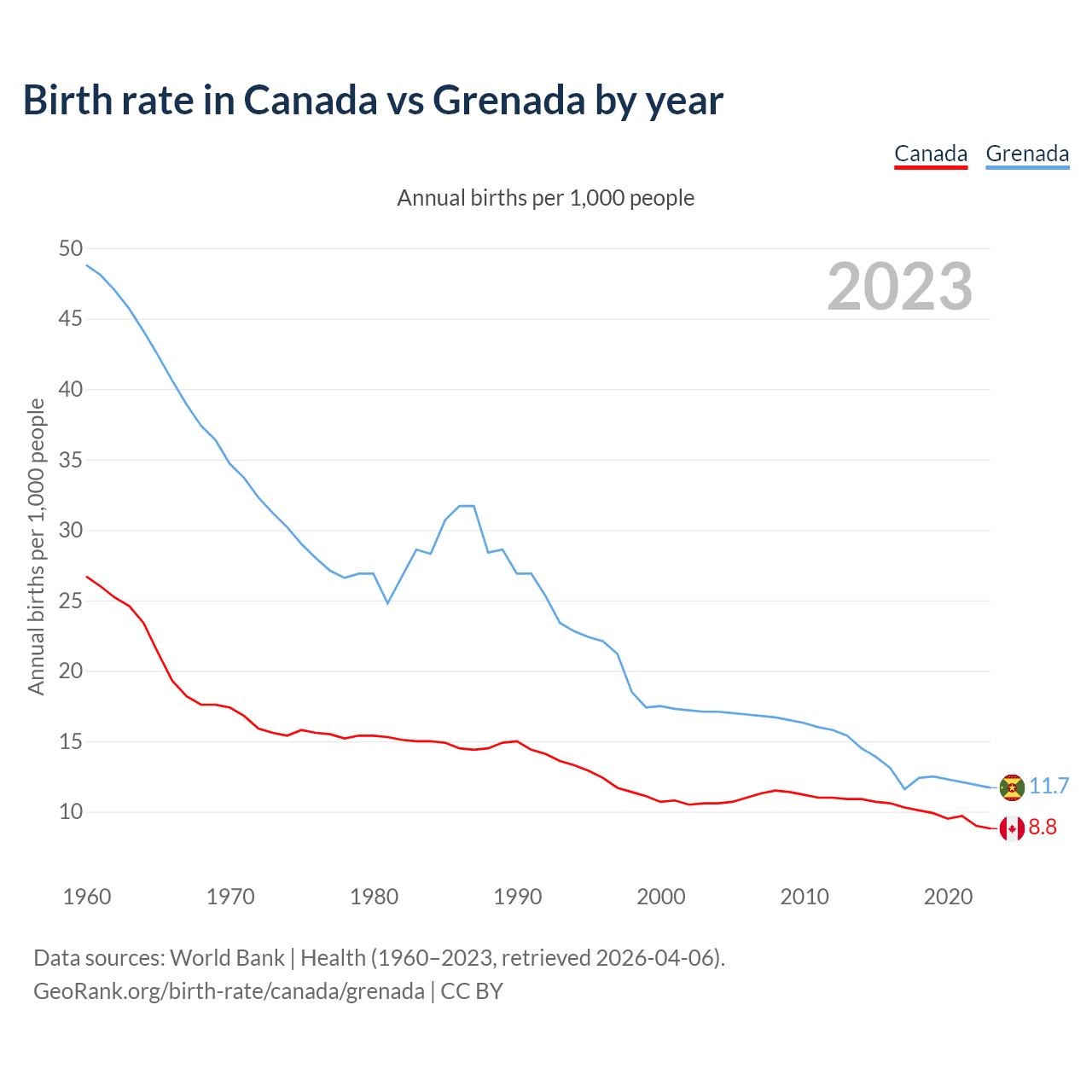 Canada has an annual birth rate of 8.8 births per 1,000 people, compared to 11.7 for Grenada. The average number of children a woman is expected to have during her lifetime — the fertility rate, is 1.26 in Canada and 1.49 in Grenada — 18% difference.