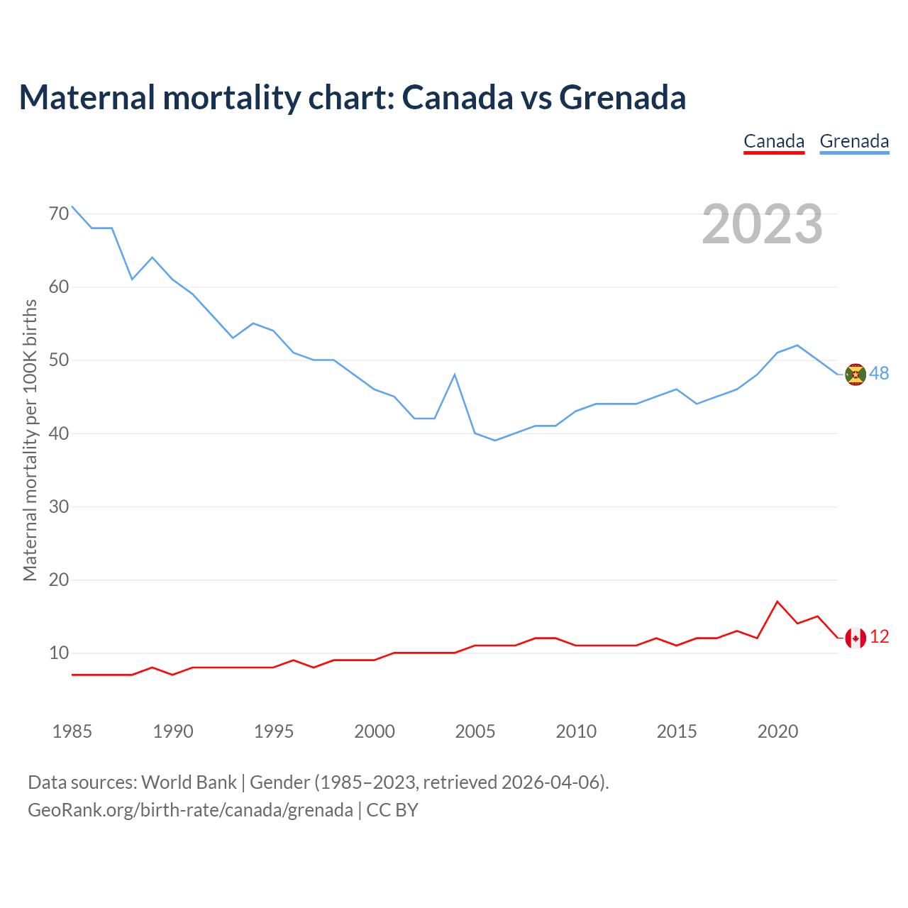 The maternal mortality rate, which is the probability of dying during childbirth or within 42 days of pregnancy termination, is 12 deaths per 100,000 live births in Canada, compared to 48 deaths in Grenada.