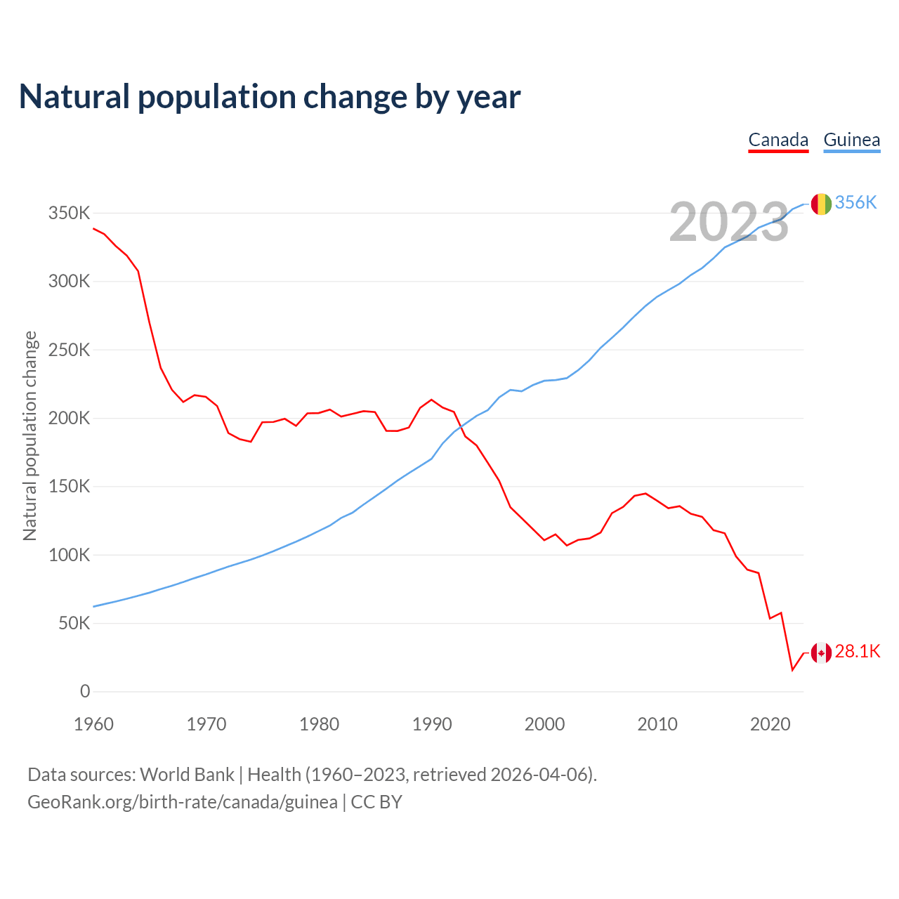 Canada has an annual birth rate of 8.8 births per 1,000 people, compared to 33.8 for Guinea. The average number of children a woman is expected to have during her lifetime — the fertility rate, is 1.26 in Canada and 4.22 in Guinea — 234.7% difference.