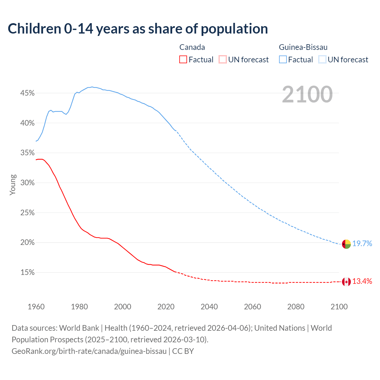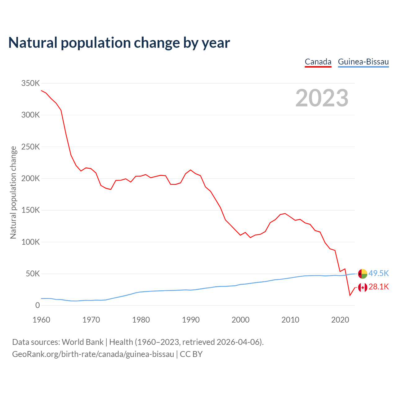Canada has an annual birth rate of 8.8 births per 1,000 people, compared to 30 for Guinea-Bissau. The average number of children a woman is expected to have during her lifetime — the fertility rate, is 1.26 in Canada and 3.84 in Guinea-Bissau — 204.4% difference.