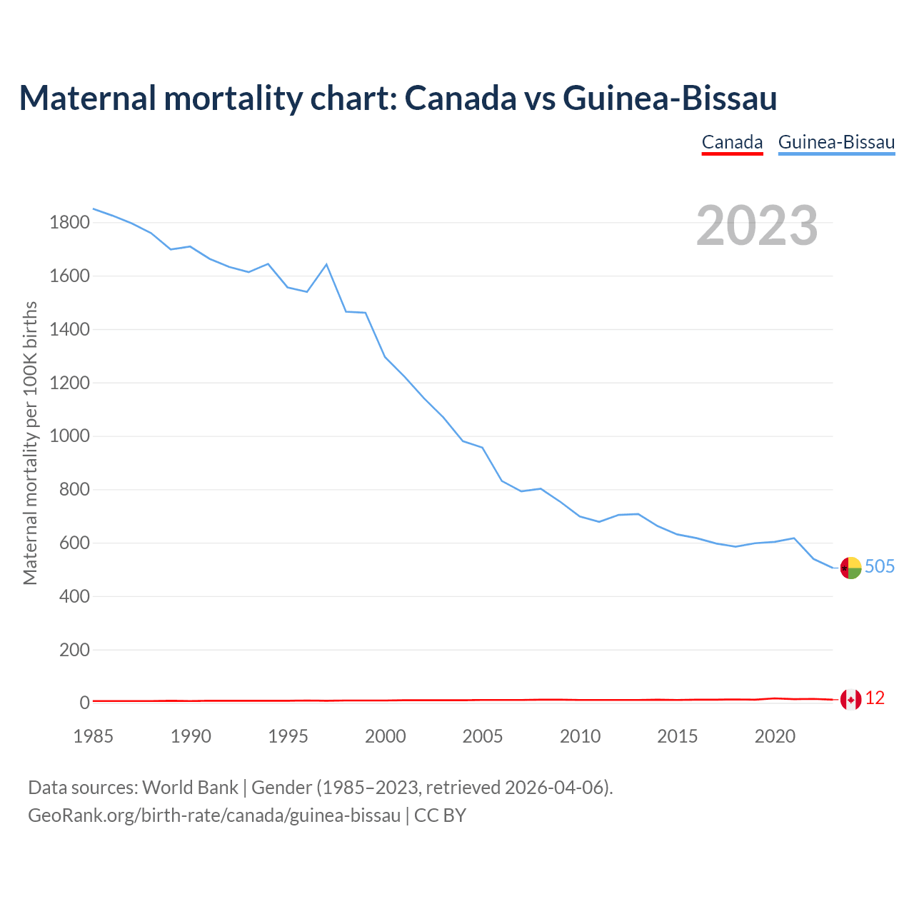 The maternal mortality rate, which is the probability of dying during childbirth or within 42 days of pregnancy termination, is 12 deaths per 100,000 live births in Canada, compared to 505 deaths in Guinea-Bissau.
