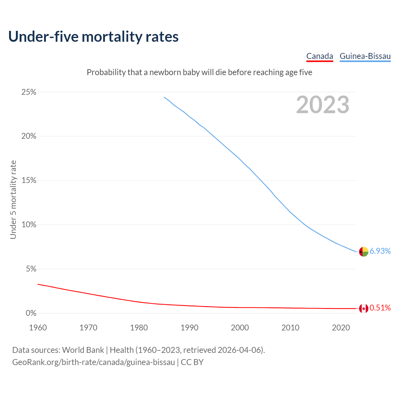 The chance that a newborn baby will die before reaching age five is 0.51% in Canada and 6.93% in Guinea-Bissau. Above is a chart with historical data on under-five mortality rates.