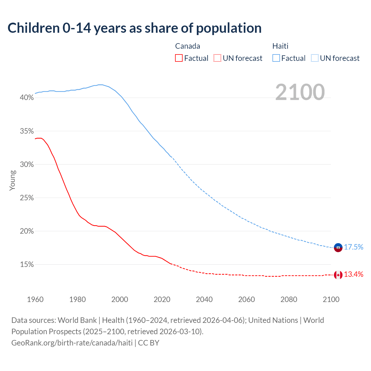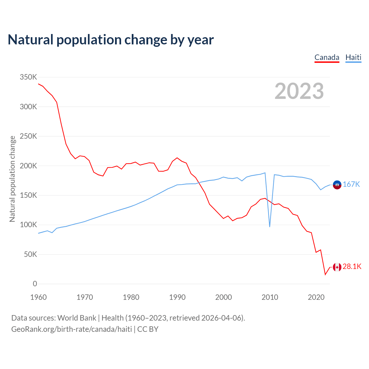 According to the latest available data on birth rates, the fertility rate in Canada was 1.26 children per woman in 2023, compared to 2.66 in Haiti in 2023. The replacement level is considered to be 2.1 children per woman.