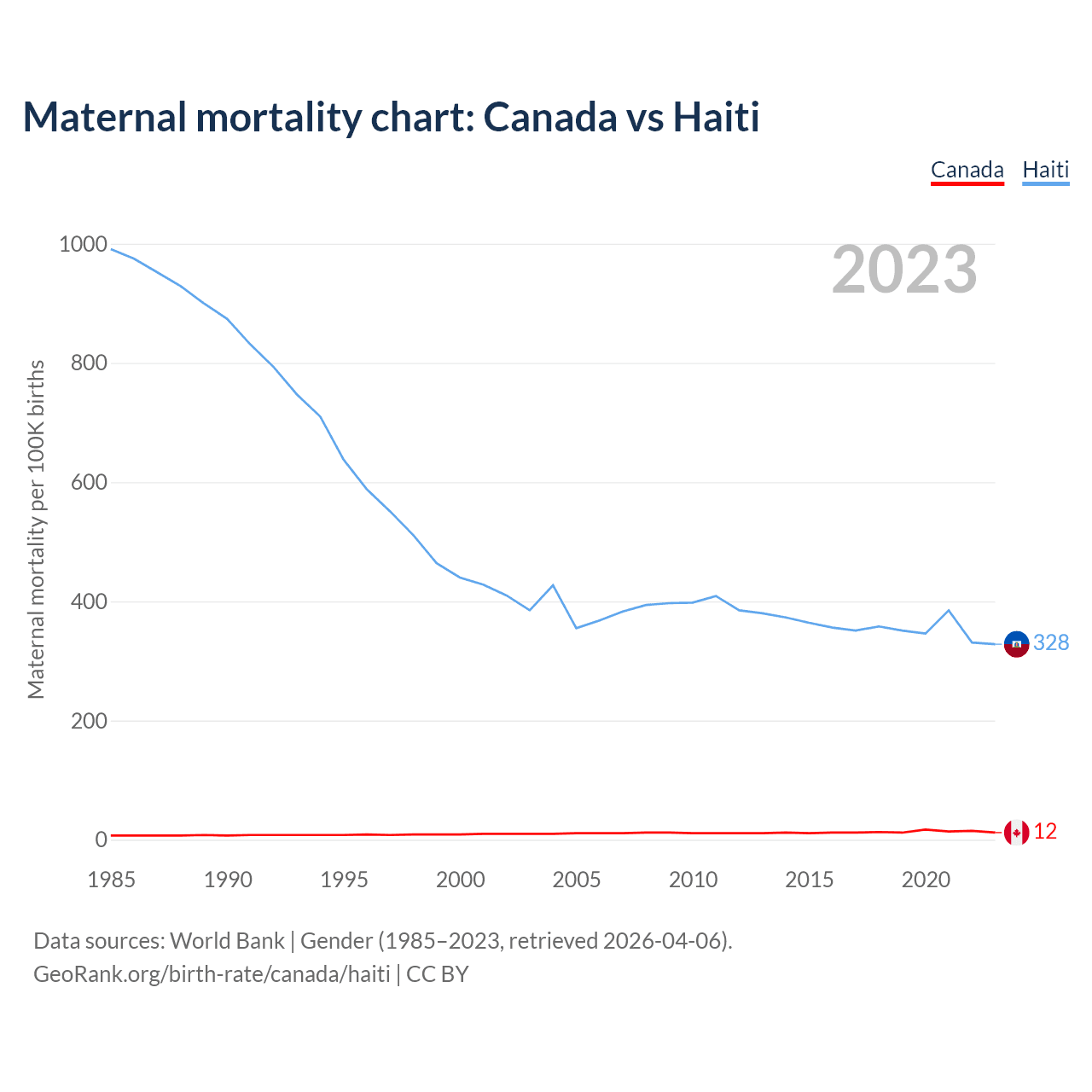 The maternal mortality rate, which is the probability of dying during childbirth or within 42 days of pregnancy termination, is 12 deaths per 100,000 live births in Canada, compared to 328 deaths in Haiti.
