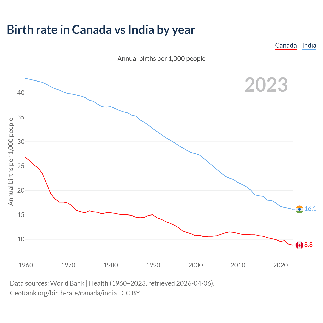 Canada has an annual birth rate of 8.8 births per 1,000 people, compared to 16.1 for India. The average number of children a woman is expected to have during her lifetime — the fertility rate, is 1.26 in Canada and 1.98 in India — 56.7% difference.