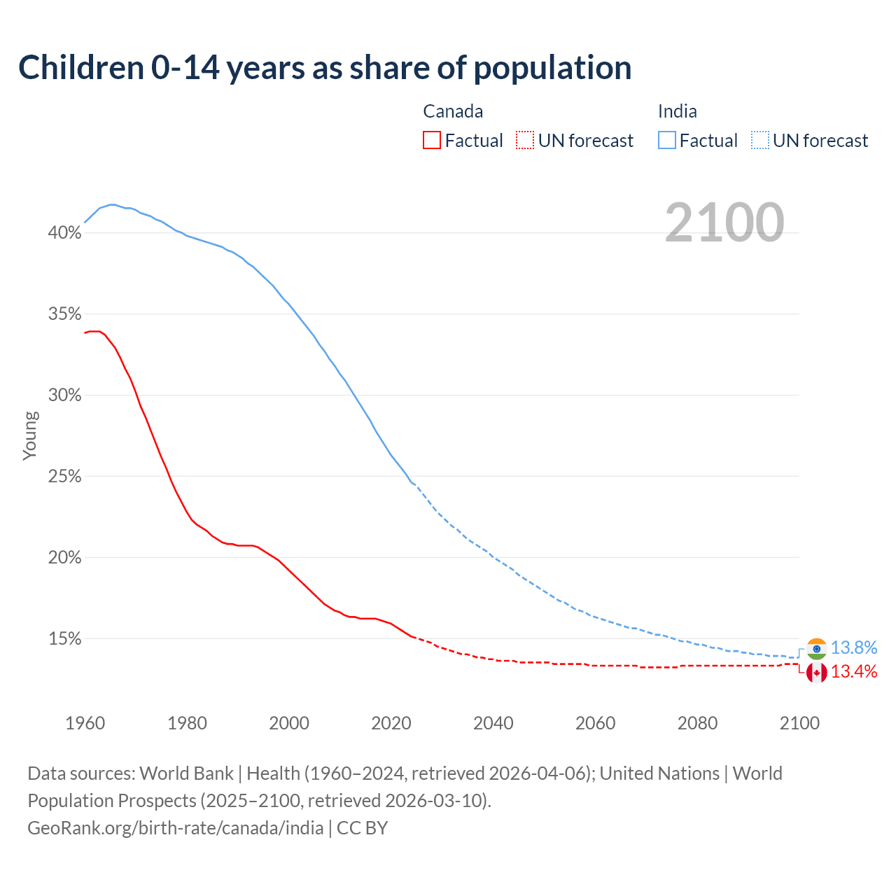 According to the latest available data on birth rates, the fertility rate in Canada was 1.26 children per woman in 2023, compared to 1.98 in India in 2023. The replacement level is considered to be 2.1 children per woman.