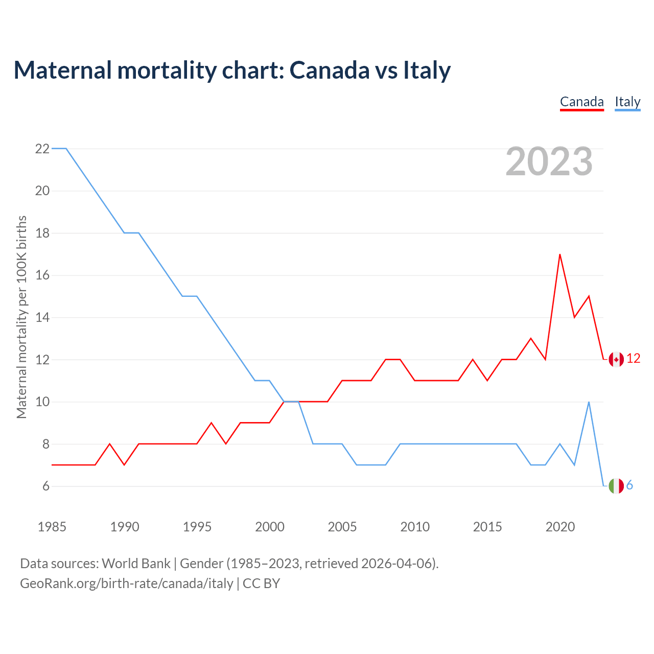 The maternal mortality rate, which is the probability of dying during childbirth or within 42 days of pregnancy termination, is 12 deaths per 100,000 live births in Canada, compared to 6 deaths in Italy.