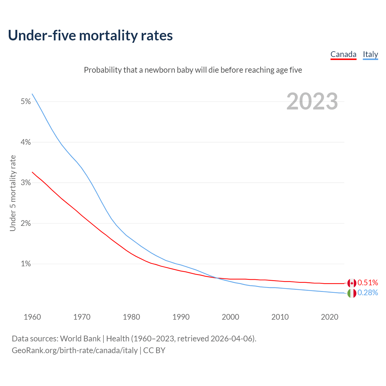 The chance that a newborn baby will die before reaching age five is 0.51% in Canada and 0.28% in Italy. Above is a chart with historical data on under-five mortality rates.