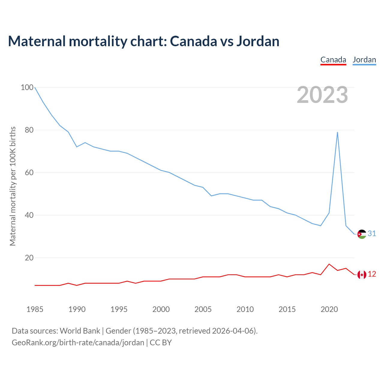 The maternal mortality rate, which is the probability of dying during childbirth or within 42 days of pregnancy termination, is 12 deaths per 100,000 live births in Canada, compared to 31 deaths in Jordan.