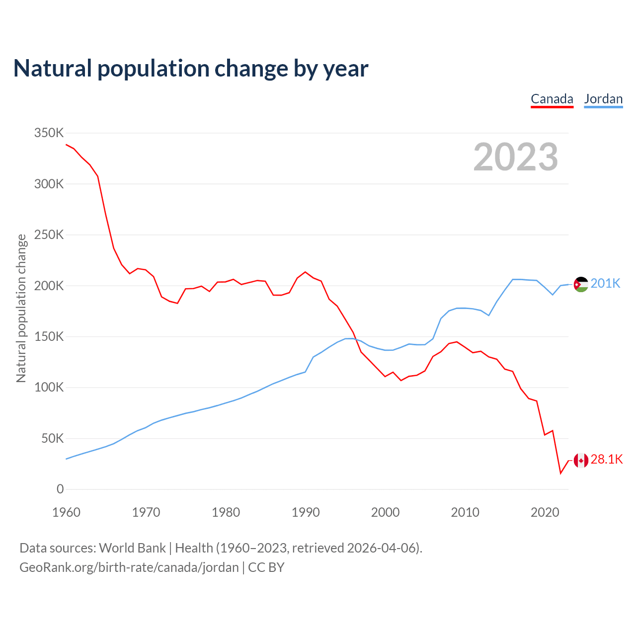 Canada has an annual birth rate of 8.8 births per 1,000 people, compared to 20.6 for Jordan. The average number of children a woman is expected to have during her lifetime — the fertility rate, is 1.26 in Canada and 2.64 in Jordan — 109.4% difference.