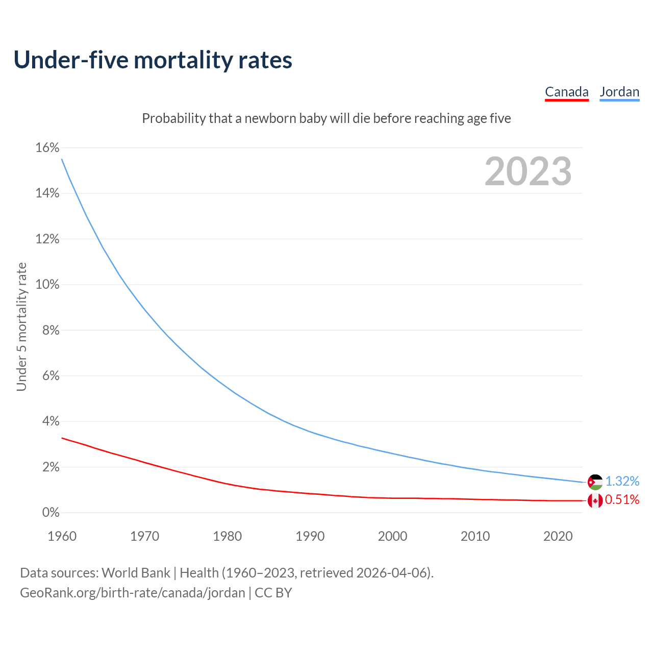 The chance that a newborn baby will die before reaching age five is 0.51% in Canada and 1.32% in Jordan. Above is a chart with historical data on under-five mortality rates.
