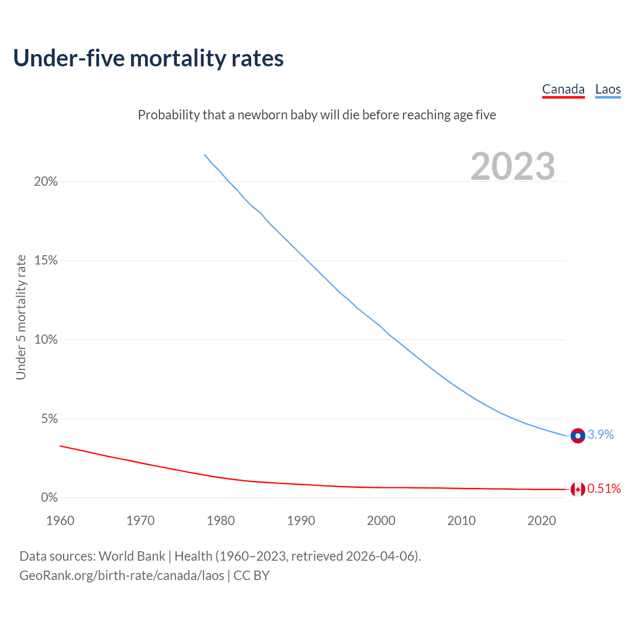 The chance that a newborn baby will die before reaching age five is 0.51% in Canada and 3.9% in Laos. Above is a chart with historical data on under-five mortality rates.