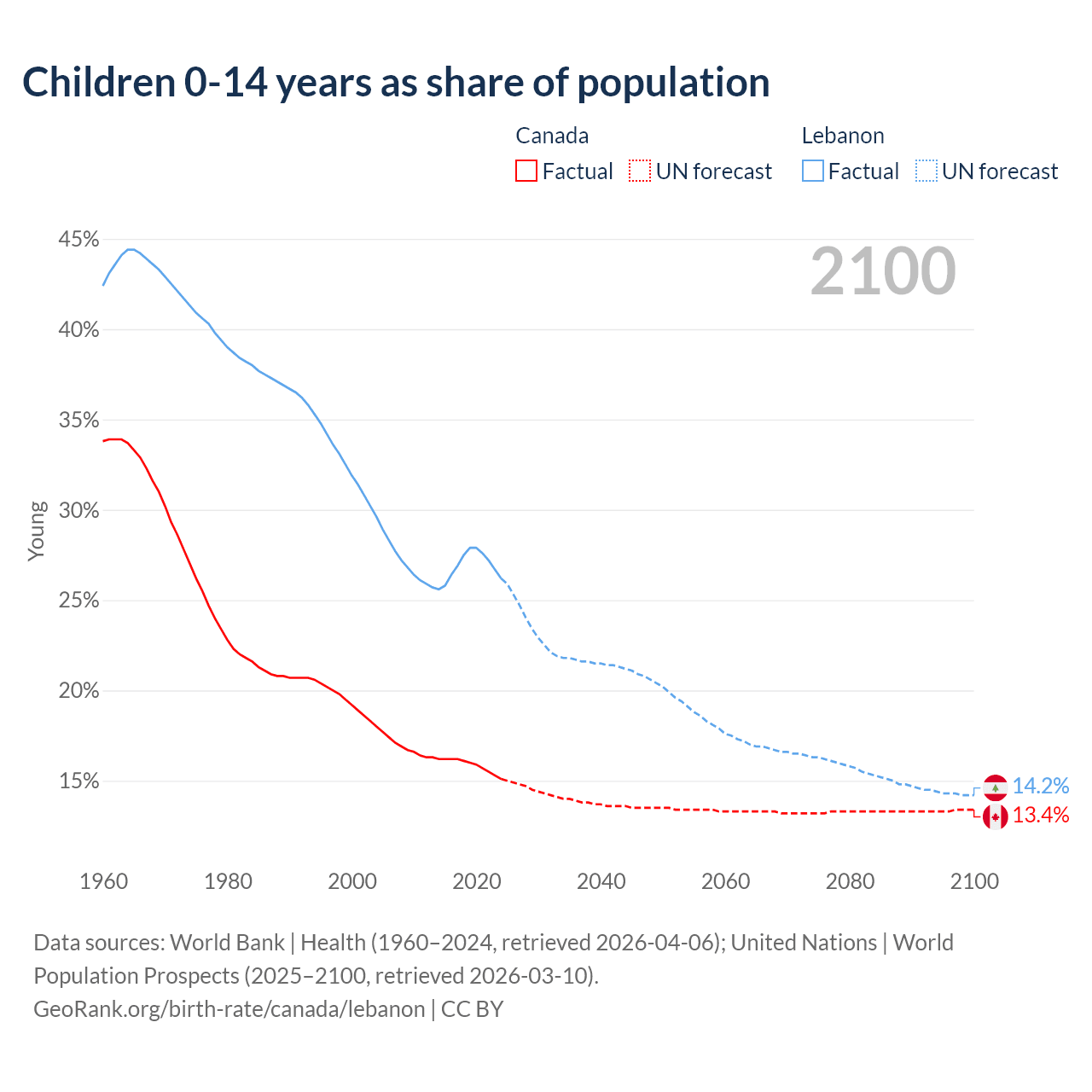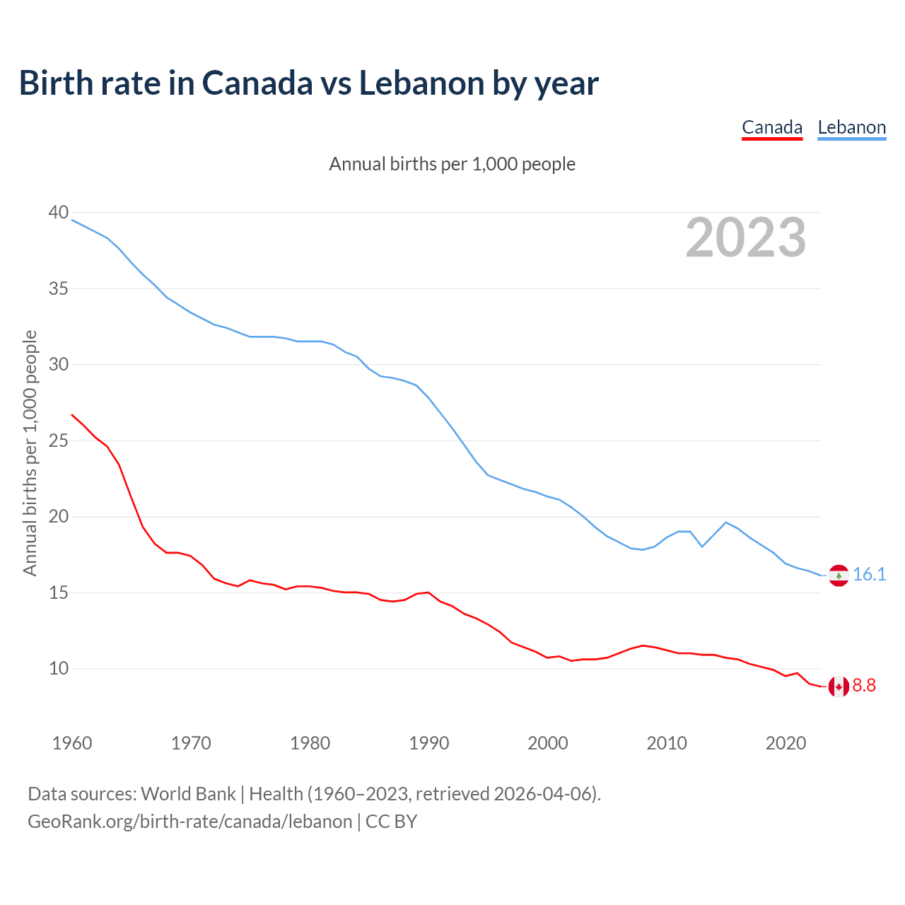 Canada has an annual birth rate of 8.8 births per 1,000 people, compared to 16.1 for Lebanon. The average number of children a woman is expected to have during her lifetime — the fertility rate, is 1.26 in Canada and 2.24 in Lebanon — 77.7% difference.