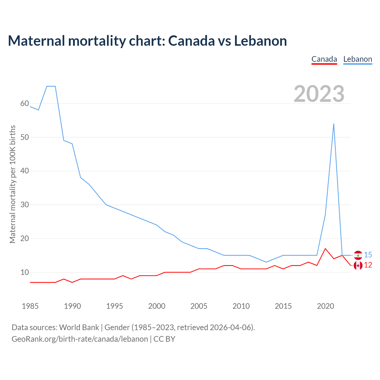 The maternal mortality rate, which is the probability of dying during childbirth or within 42 days of pregnancy termination, is 12 deaths per 100,000 live births in Canada, compared to 15 deaths in Lebanon.