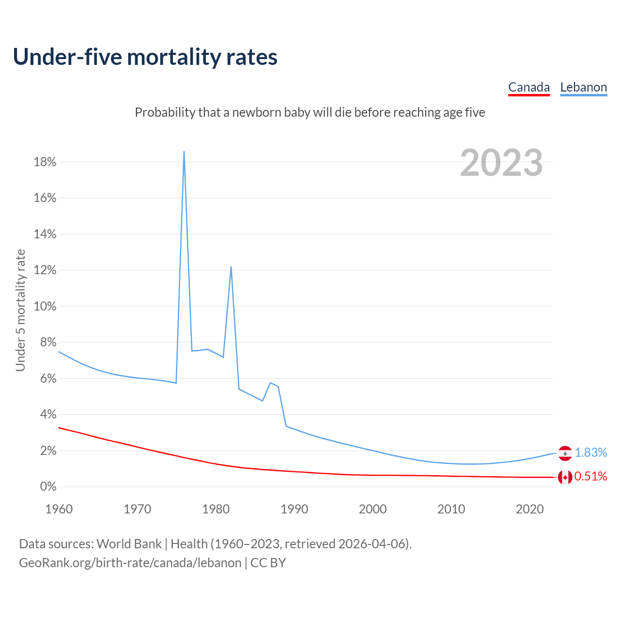 The chance that a newborn baby will die before reaching age five is 0.51% in Canada and 1.83% in Lebanon. Above is a chart with historical data on under-five mortality rates.