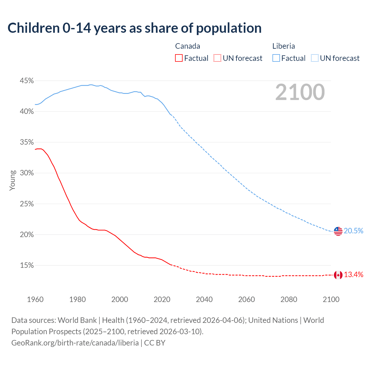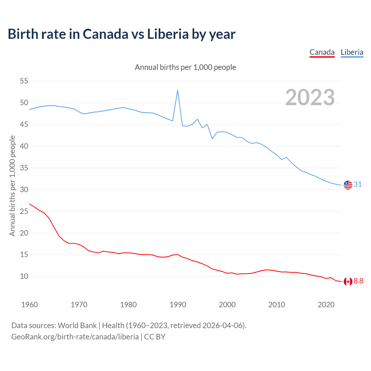 Canada has an annual birth rate of 8.8 births per 1,000 people, compared to 31 for Liberia. The average number of children a woman is expected to have during her lifetime — the fertility rate, is 1.26 in Canada and 3.95 in Liberia — 213.5% difference.