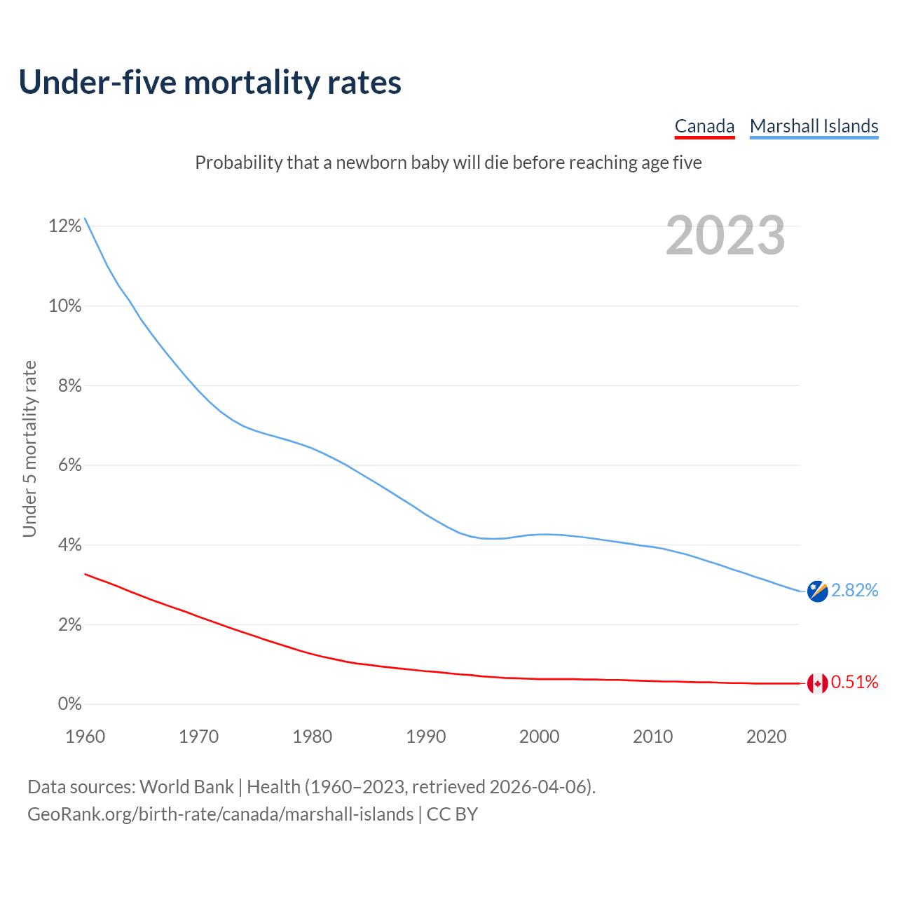 The chance that a newborn baby will die before reaching age five is 0.51% in Canada and 2.82% in the Marshall Islands. Above is a chart with historical data on under-five mortality rates.