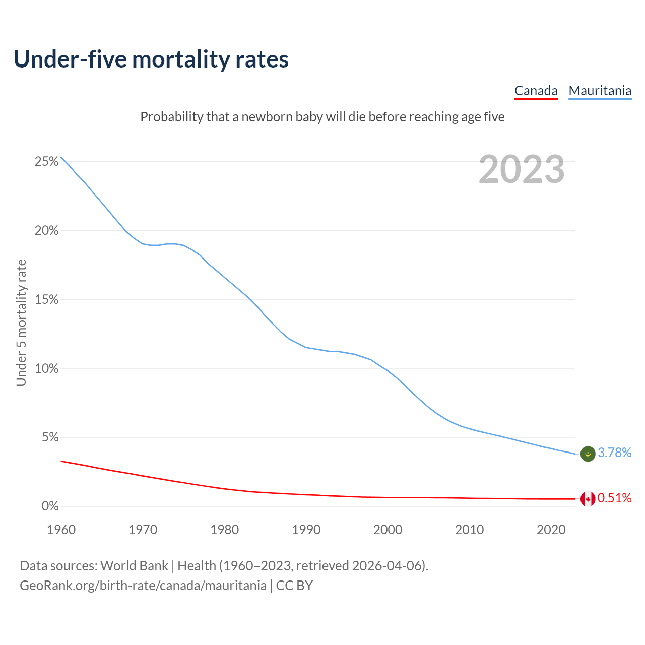 The chance that a newborn baby will die before reaching age five is 0.51% in Canada and 3.78% in Mauritania. Above is a chart with historical data on under-five mortality rates.