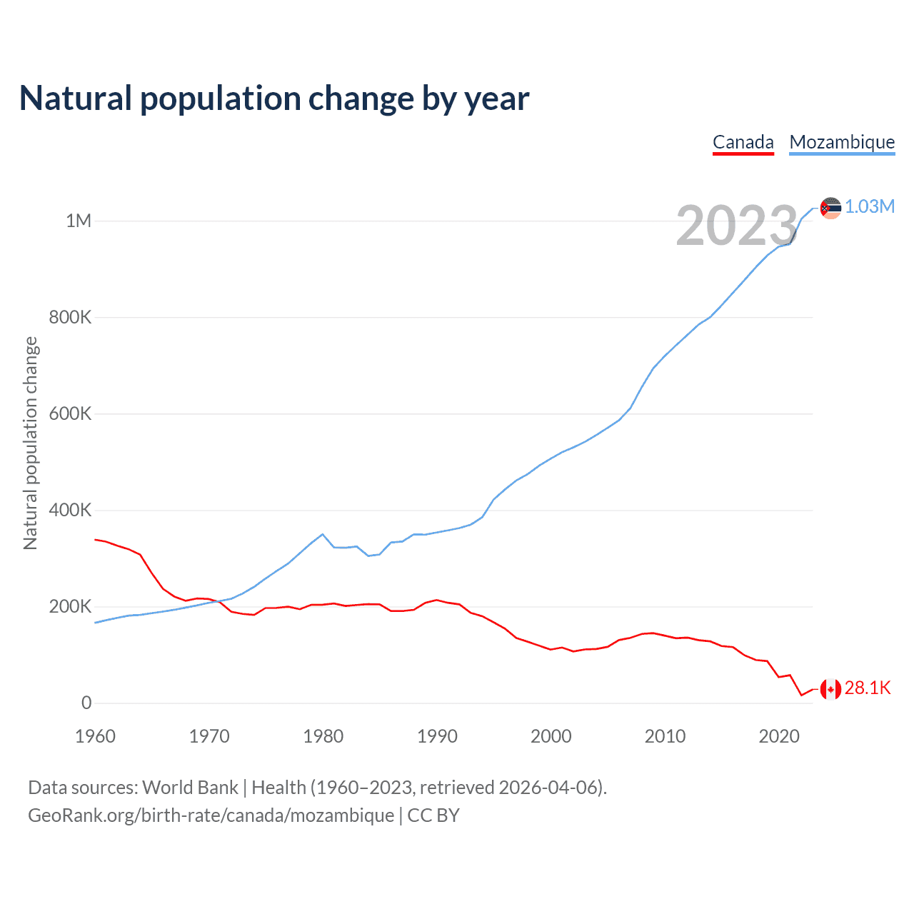 Canada has an annual birth rate of 8.8 births per 1,000 people, compared to 37.5 for Mozambique. The average number of children a woman is expected to have during her lifetime — the fertility rate, is 1.26 in Canada and 4.76 in Mozambique — 278% difference.