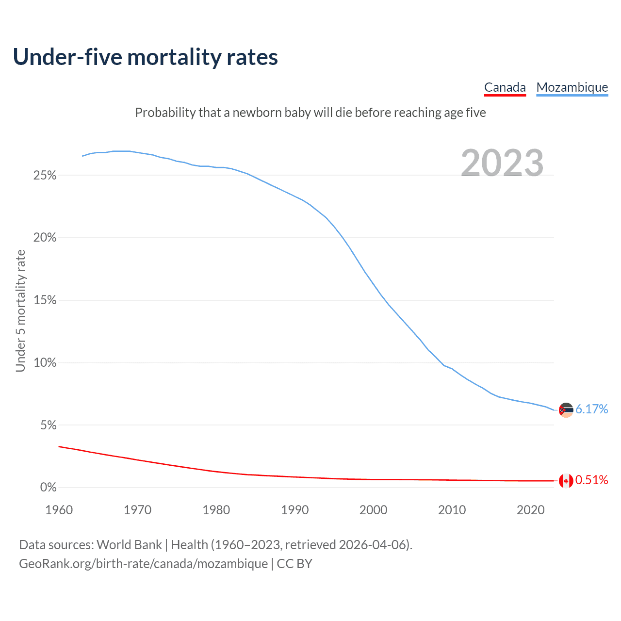 The chance that a newborn baby will die before reaching age five is 0.51% in Canada and 6.17% in Mozambique. Above is a chart with historical data on under-five mortality rates.